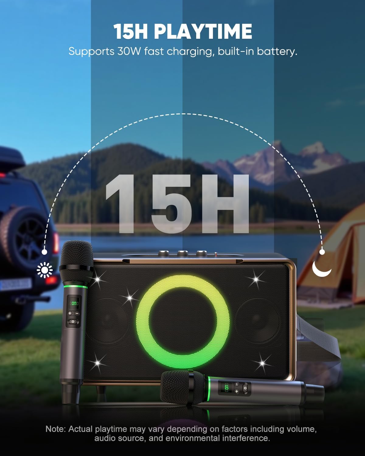 - 15H LONG PLAYTIME: Big & Loud Speaker: 15-hour battery life + 30W fast charging (fully charged in just 2.5 hours)! Bluetooth 5.3 ensures smooth music streaming, ideal for camping, backyard parties, and birthday celebrations.