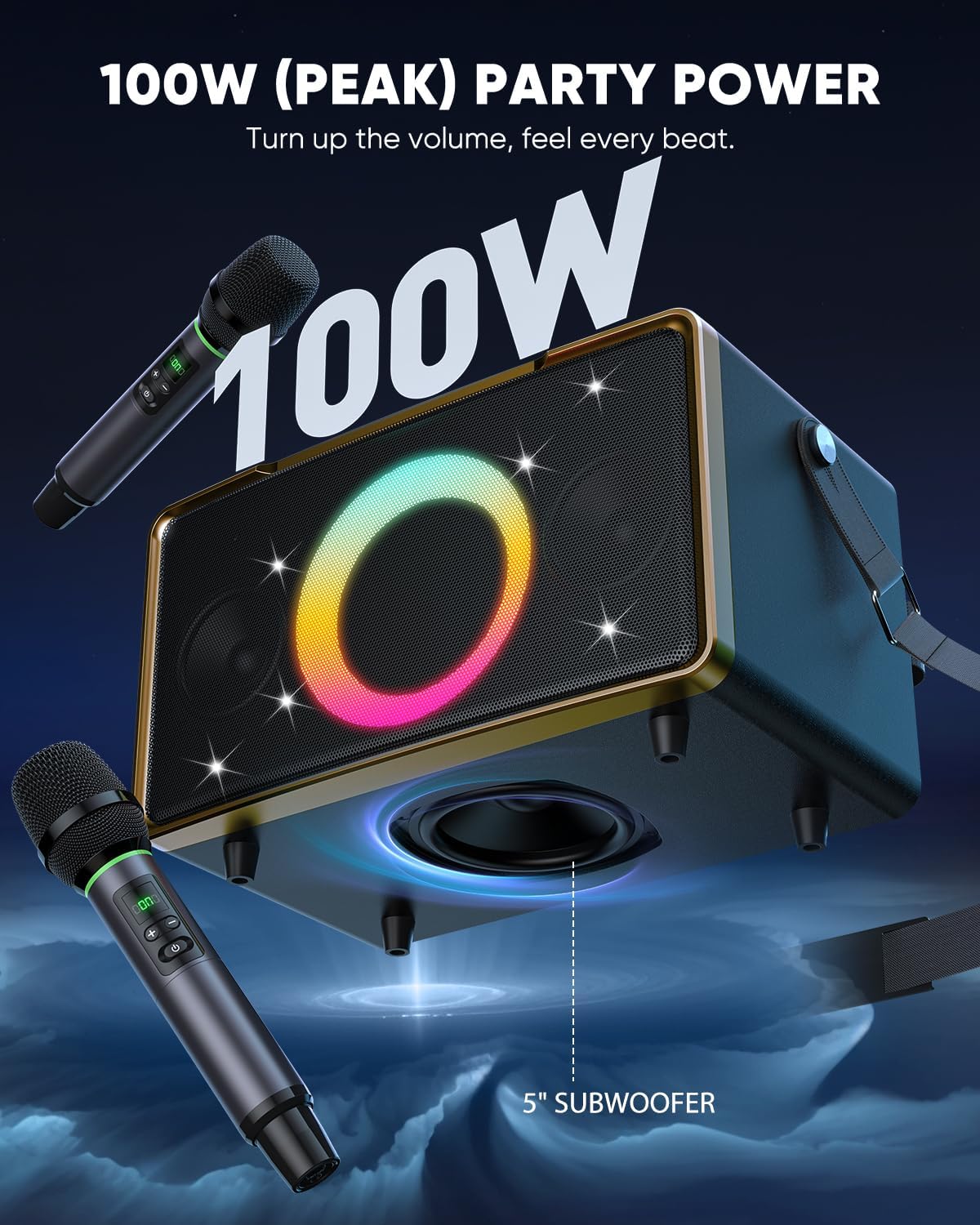 - 100W OUTPUT & 5" SUBWOOFER: GFEEN party Bluetooth speaker delivers powerful 100W peak power and a 5-inch subwoofer, delivering an immersive and powerful bass experience for music enthusiasts of hip-hop, rock, classical, electronic, and beyond. Creates a concert-like audio experience.