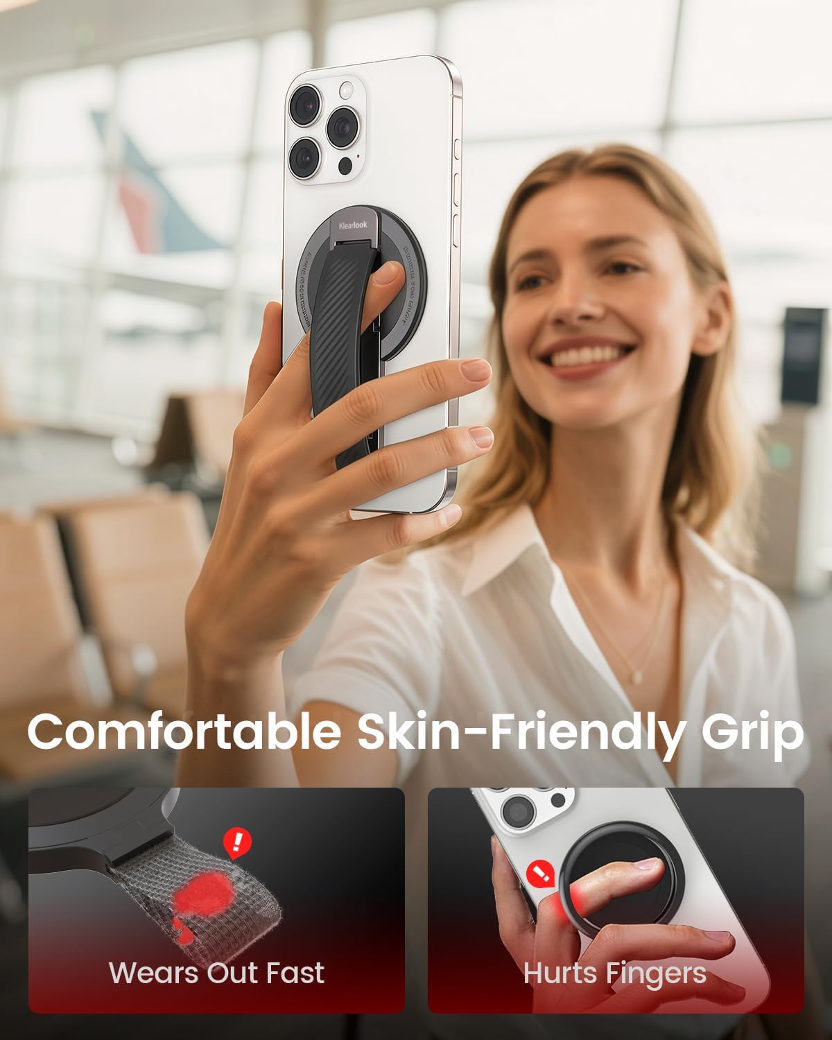 - [Soft Grip for Everyday Comfort] The grip strap uses soft silicone that’s skin-friendly, gentle on hands, and won’t scratch. It’s comfortable to hold for long periods without slipping or fatigue—ideal for daily use at home, on the go, or during extended screen time.