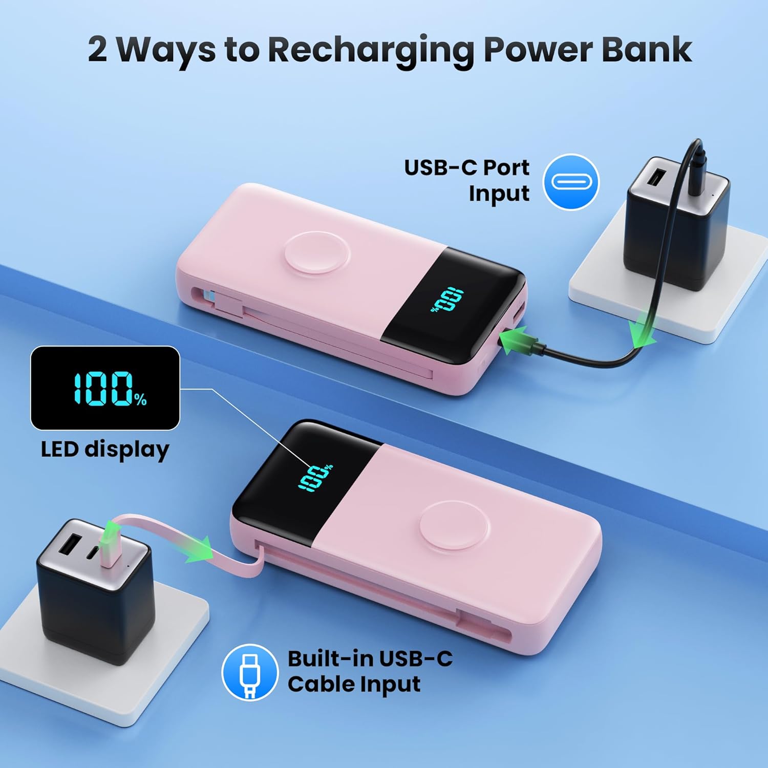 - ă5-in-1 Portable chargerăWith a total of 5 output ports (2 built-in cables, 1 iWatch Charger, 1 USB-A, and 1 USB-C), this power bank can charge up to 5 devices simultaneously and recharge itself with 2 options(USB C cable,USB C port),which is great for multi electronics users who has iPhone, android or Apple Watch and other usb devices.