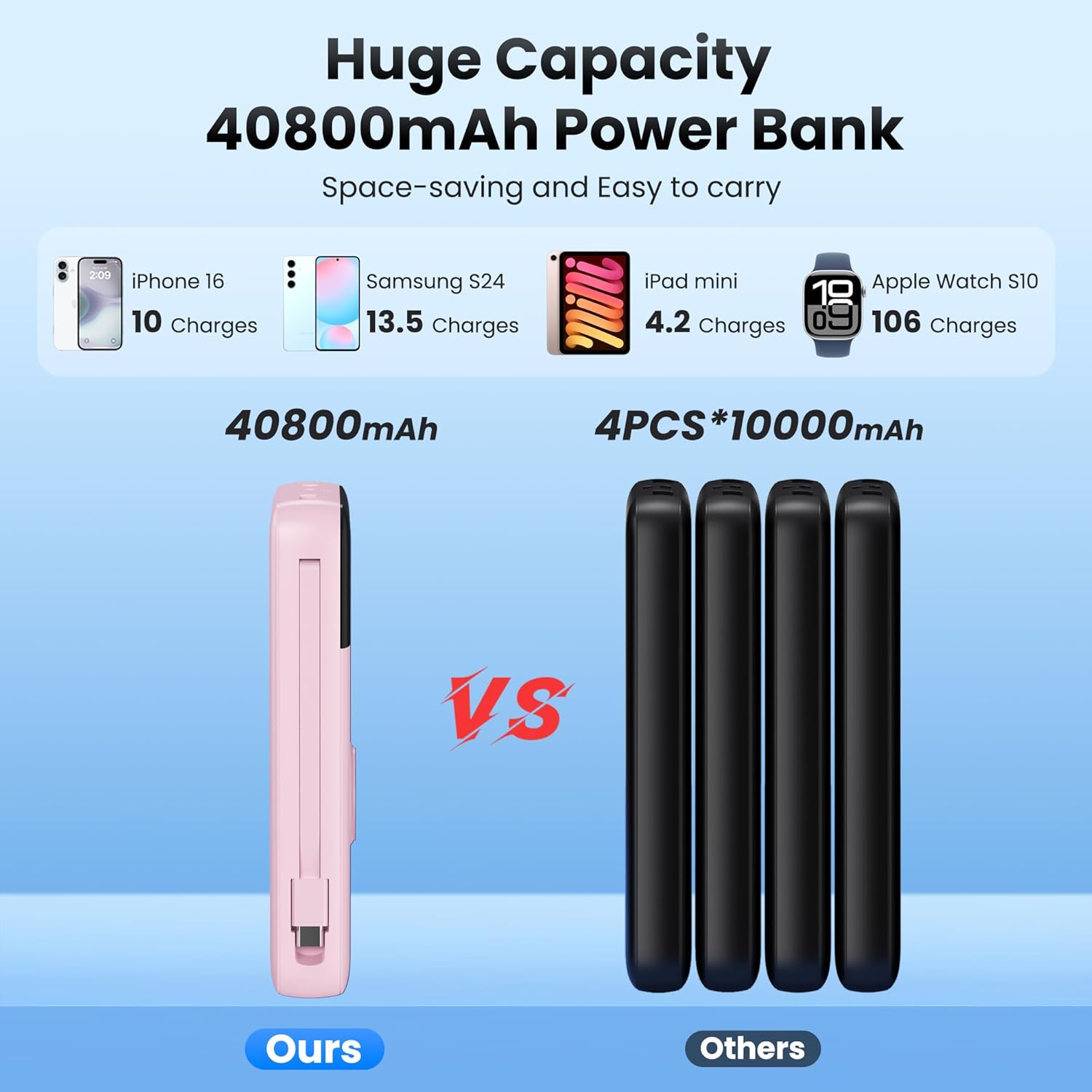 - ăPortable Power Bank with Built-In Cables& iWatch chargerăThis 40800mAh power bank with built in 2 cables (Type-C, ios,) and magnetic wireless charger for iWatch, Widely compatible with iPhone 16/15/14/13/12/ 11/XS /XR/ SE Pro /Pro Max, Samsung S24/S23 Series,Google Pixel,LG, Moto,tablets,Android devices,Apple Watch Ultra 2/Ultra/10/9/8/7/6/SE/5/4/3/2, AirPods and more.