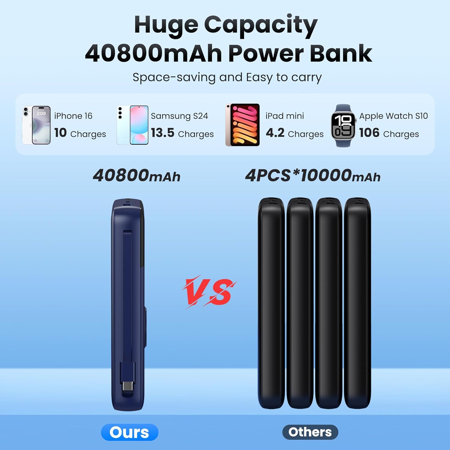 - ăPortable Power Bank with Built-In Cables& iWatch chargerăThis 40800mAh power bank with built in 2 cables (Type-C, ios,) and magnetic wireless charger for iWatch, Widely compatible with iPhone 16/15/14/13/12/ 11/XS /XR/ SE Pro /Pro Max, Samsung S24/S23 Series,Google Pixel,LG, Moto,tablets,Android devices,Apple Watch Ultra 2/Ultra/10/9/8/7/6/SE/5/4/3/2, AirPods and more.
