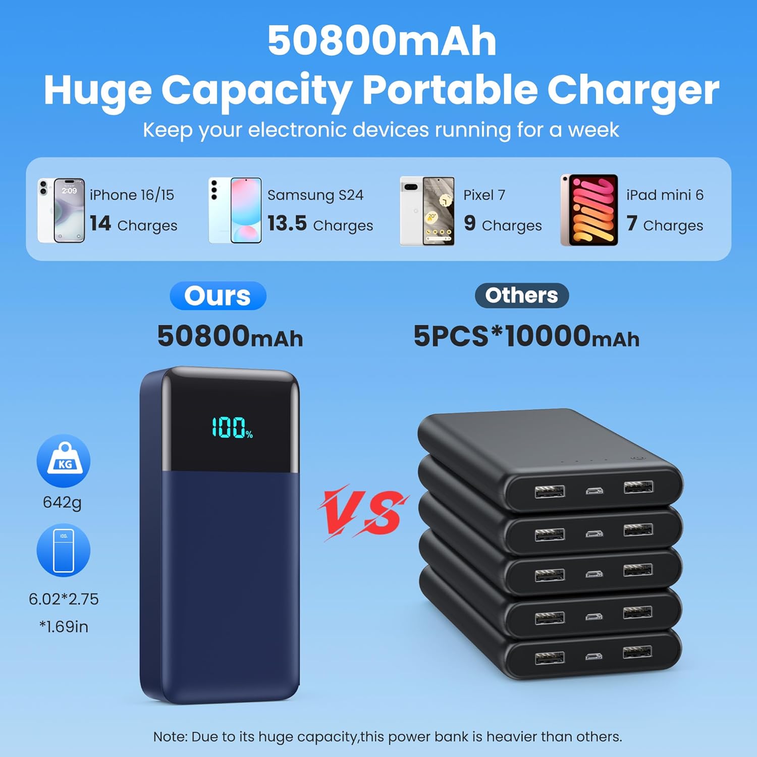Portable Charger 50800mAh Power Bank with 3 Built in Cable,25W PD QC4.0 Fast Charging USB C Battery Pack,6 Output 2 Input LCD Display Portable Phone Charger for iPhone 16/15/14,Google,Android, Blue
