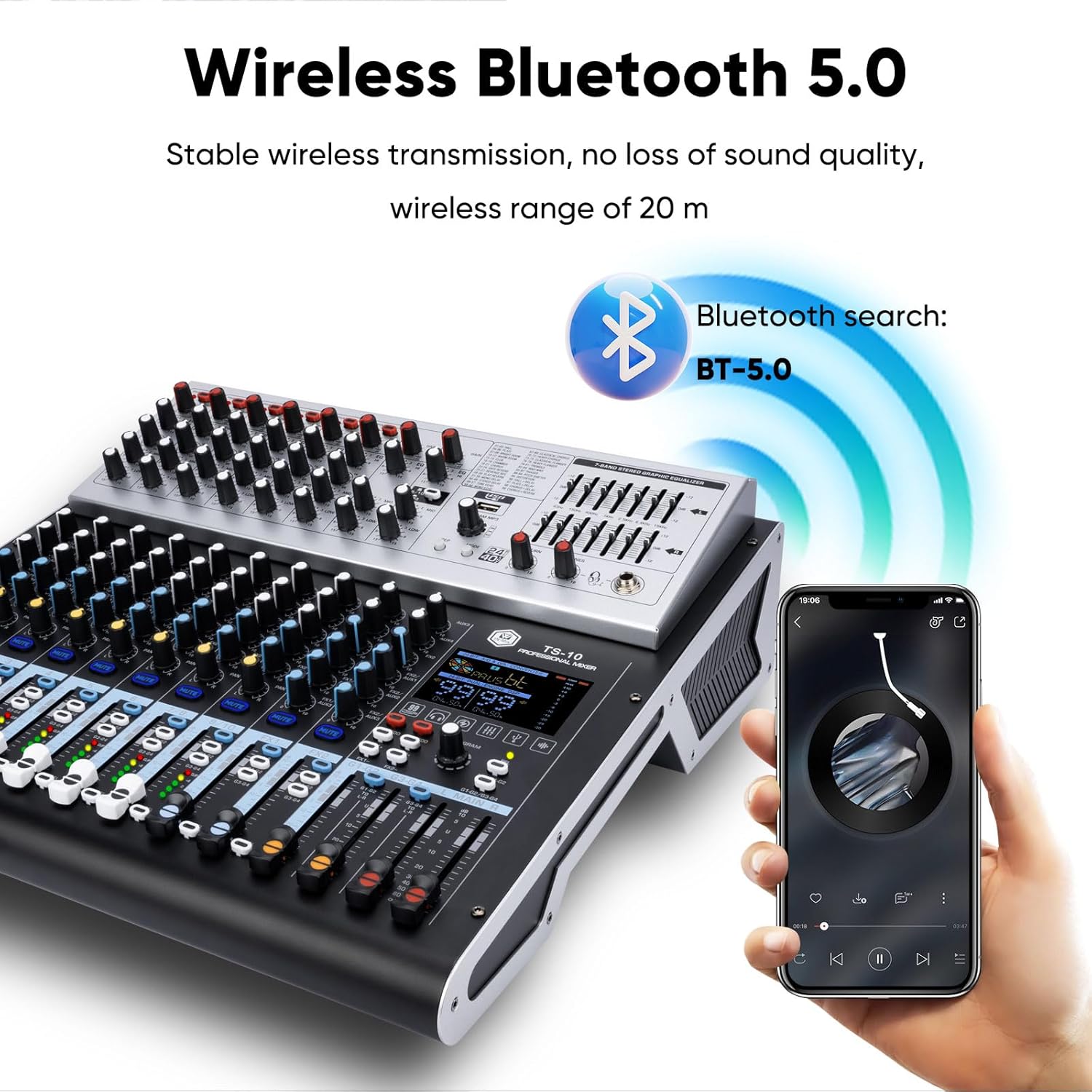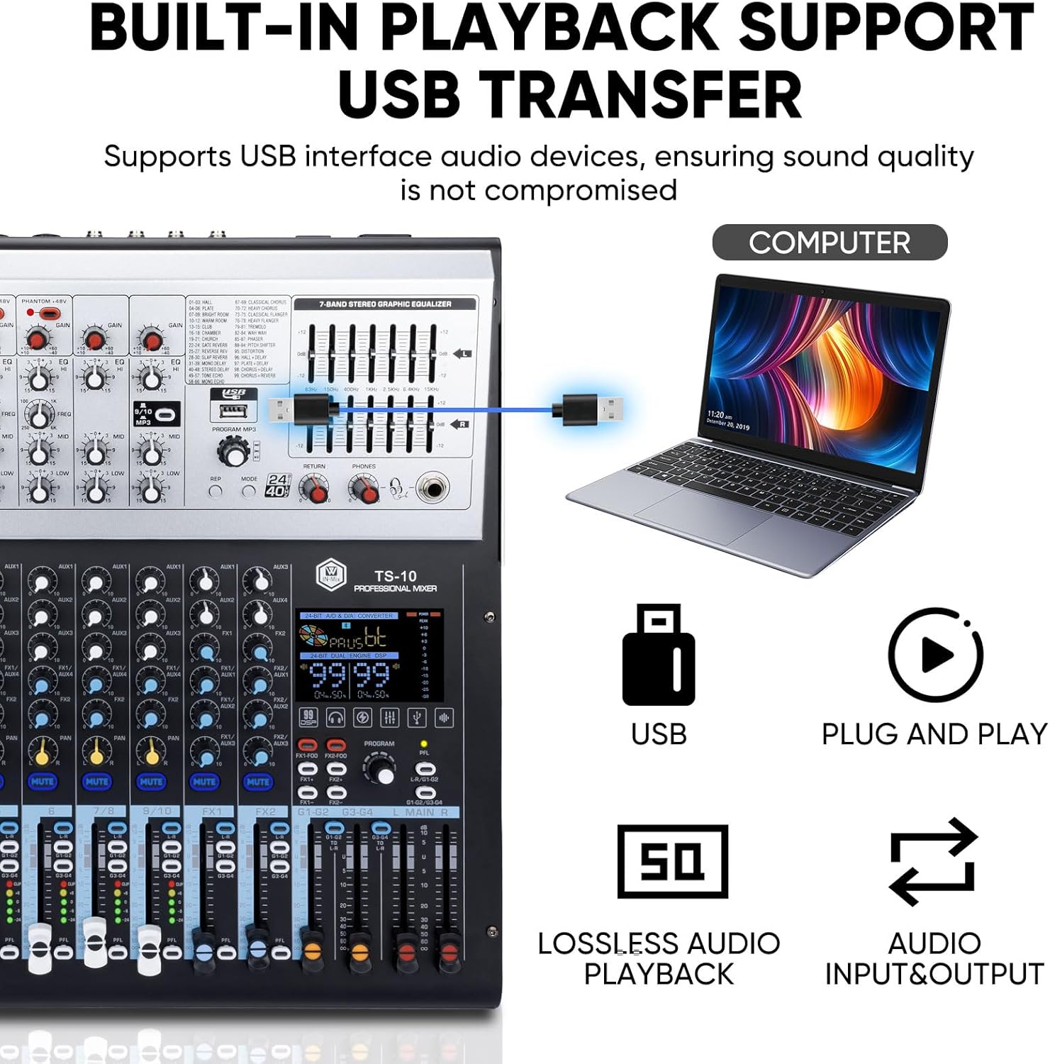 W IN-MIX Professional DJ Audio Mixer,10 Channel with 99DSP Digital Effects, MP3 Player, 48V Phantom Power with Independent Mute Switches Audio Console For Studio & Stage