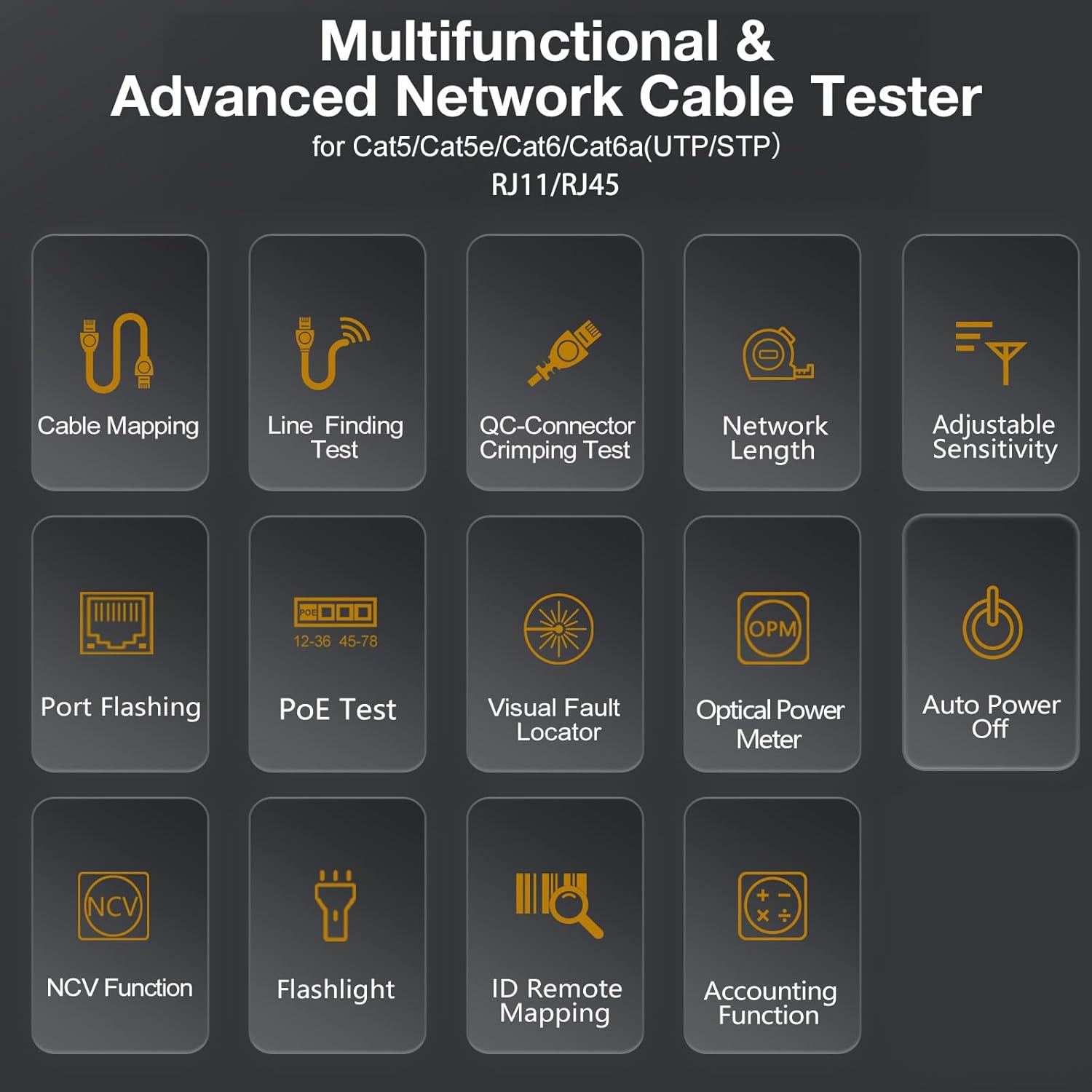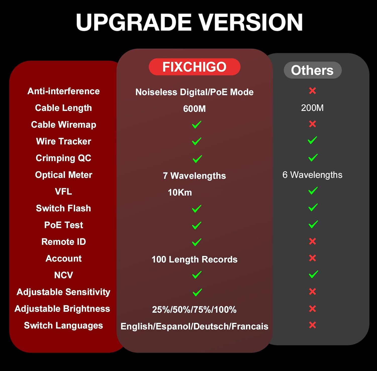 - 10 In 1 FIXCHIGO Network Cable Tester: Feature with cable length, cable wire map, wire tracker, crimping QC, optical meter, VFL, switch flash, PoE test, remote ID and account which can meet any of your needs and find and fix it by yourself.