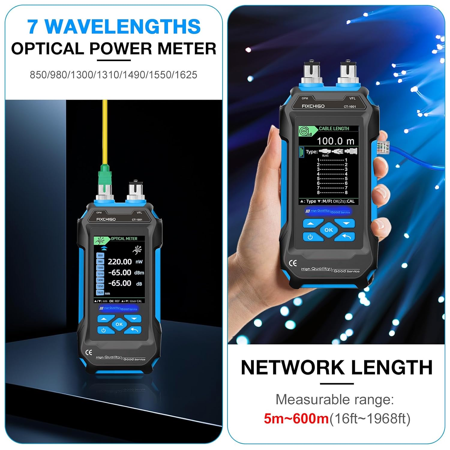 - Update Version: Compared to other products in the market, we have added more features that can satisfy the needs of consumers. Measurable network length is 16ft~1968ft(5m~600m) and can length self-calibration. Optical power meter measure 7 standard wavelengths 850/980/1300/1310/1490/1550/1625, measurable range: -70~+6dBm can support ST/SC/FC adapters. ID remote mapping can map and identify multiple cable runs in one step. Accounting function keep up to 100 length records and calculate network costs. NCV test has adjustable signal strength. Enter Connection Prompt can instructed which port to plug the cable into.