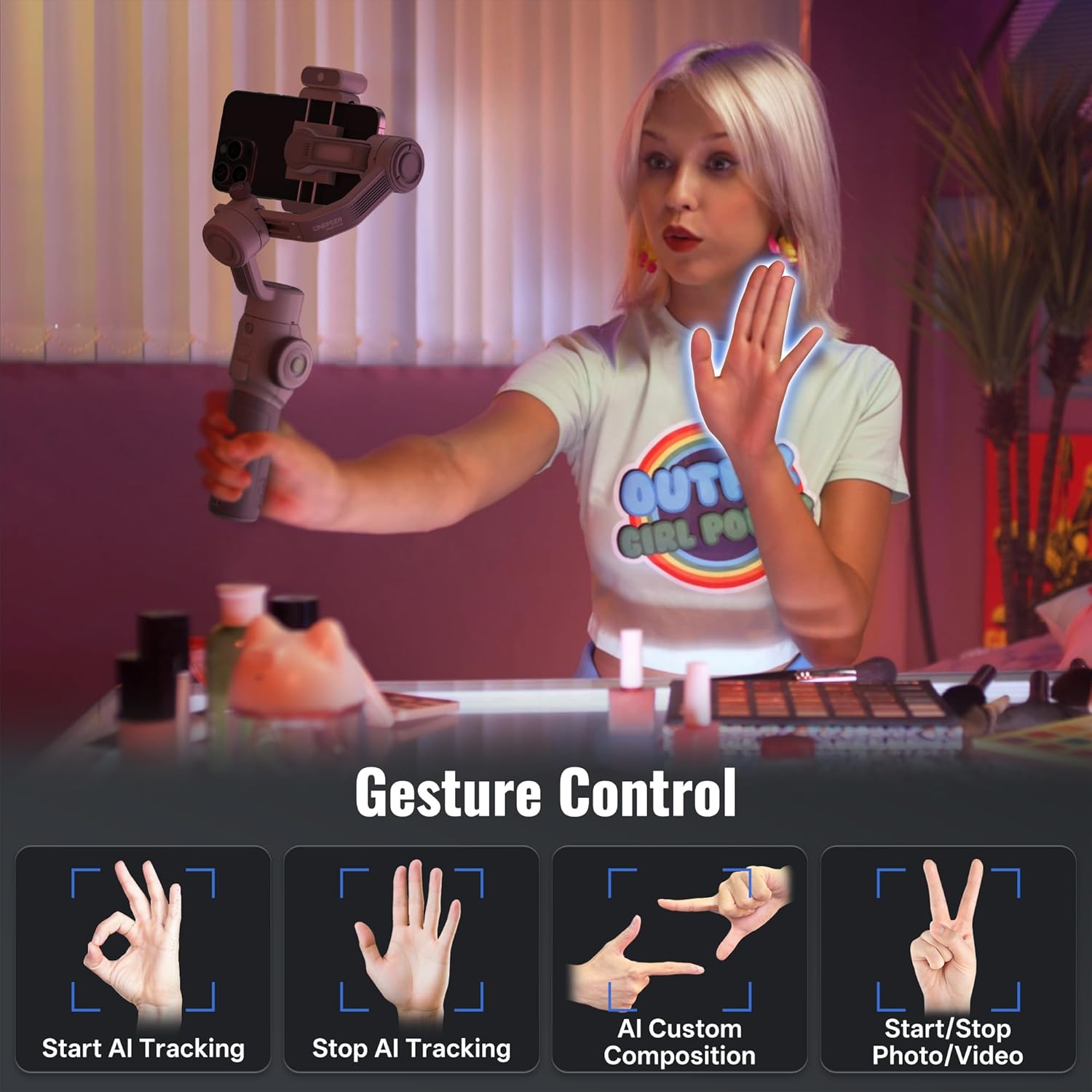 - [Remote recognition, AI Tracking] AI tracking phone gimbal stabilizer without using the ZY Cami App, you can use the magnetic Ai tracking module to quickly lock and follow people in the phone's native camera, beauty apps, short video apps and other shooting apps. You can use different gestures to start tracking, composing and video recording remotely.