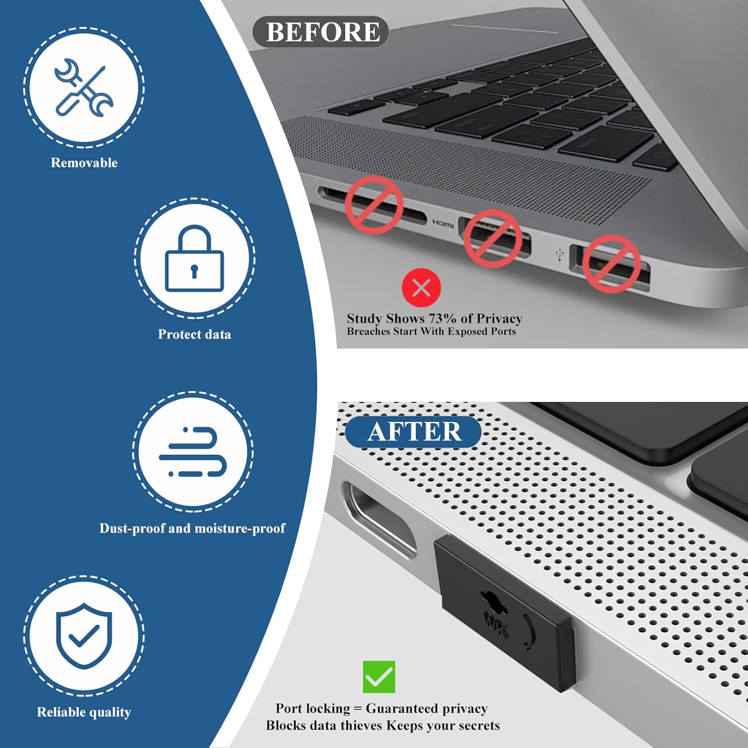 - Two-Way Protection: Our premium USB-A port blocker provides dual-layer protection. It physically blocks USB ports to prevent unauthorized access and safeguard your data integrity, while also shielding your device from dust to extend its lifespan.