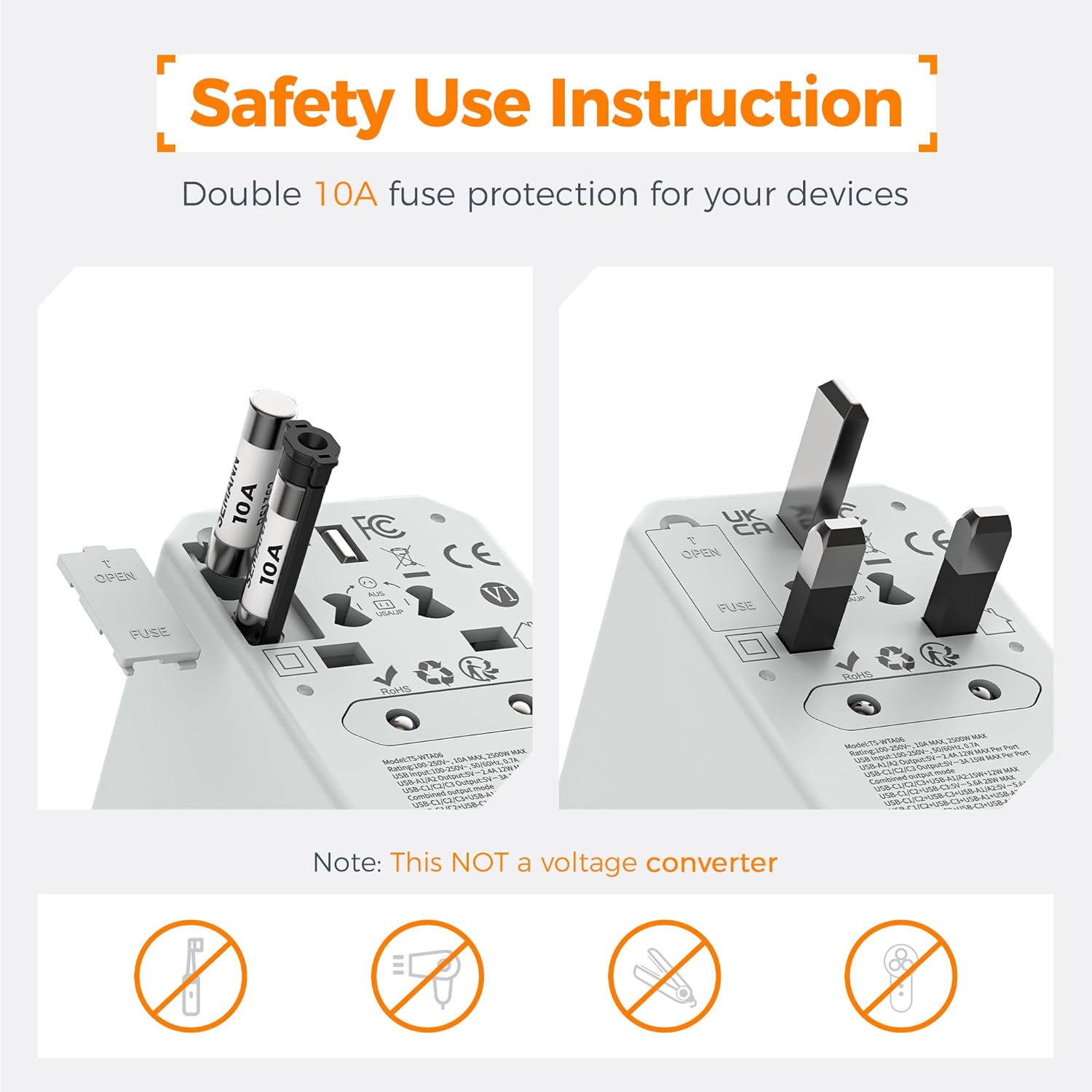 - Warm Tips: The travel power adapter is not a a voltage converter; Outlet adapter international works on 100V to 250V wide voltage devices; If you want to use hair dryer, straightener, curling irons, they need to support wide voltage