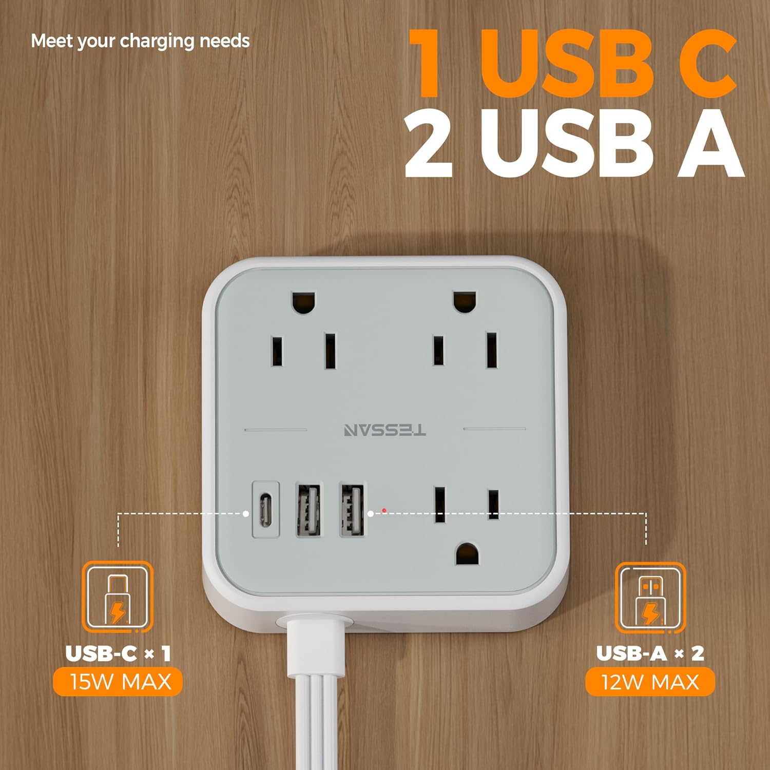 - 1 USB C and 2 USB A: The extension cord with USB ports features USB C (15W max), charge phone, tablet, and other devices, reducing waiting time; The USB A delivers 12W max; Small power strip meets your various charging needs