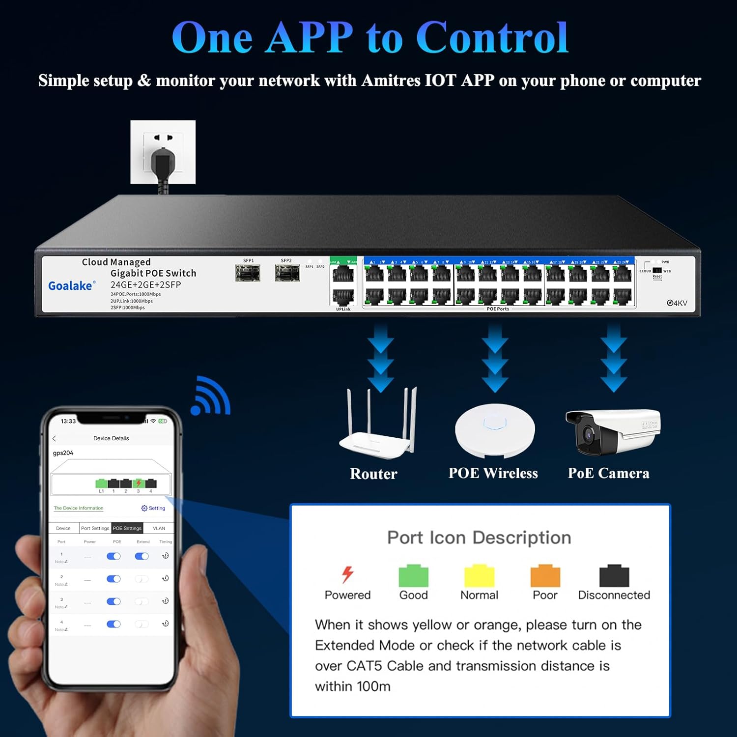 - Enhanced Power and Flexibility: Easy Smart Management allows you to manage and configure your network effortlessly via a app or a comprehensive web interface and free software, easily monitor and manage your network from anywhere with the intuitive cloud management interface. Experience the superior power and flexibility of Goalake PoE switches with POE+. Enjoy cost savings and simplified installations with plug-and-play functionality, making it easier to set up IP cameras and wireless access points. You can mount the PoE switch on the wall or desktop, perfect solution for home office and a variety of environments.