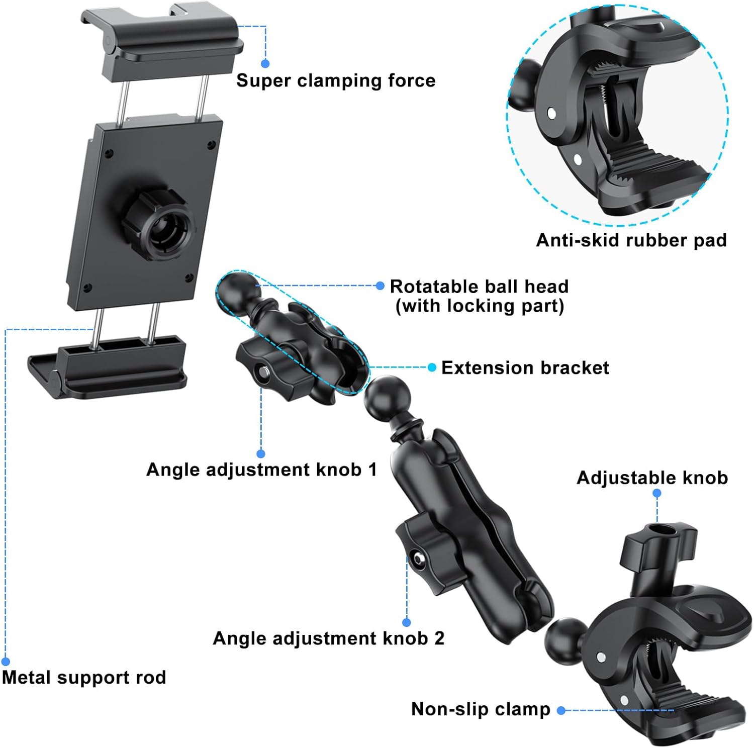 - 2. Angle It However You Want: This iPad clamp mount comes with four ball joints that spin 360 degrees, so you can tweak it any way you like. Just turn one knob to loosen or lock, and bam—you’ve got the perfect angle with no blind spots in a flash. Setting up this treadmill tablet mount or phone holder for Peloton bike? Easy as pie, no sweat.