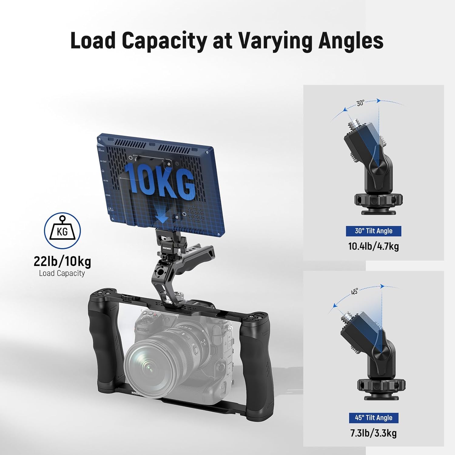 - 【Solid & Lightweight】 The camera cage (weight: 22.9oz/650g, max load: 33lb/15kg), top handle (weight: 5.1oz/145g, max load: 22lb/10kg), and monitor mount (weight: 1.9oz/55g, max load: 10.4lb/4.7kg at 30°; 7.3lb/3.3kg at 45°) are crafted from lightweight yet robust black anodized aluminum alloy, professional film stabilizer holder for video recording, filming, YouTube/TikTok vlogging, filmmaking indoors and out as content creator essential, video maker influencer must have equipment