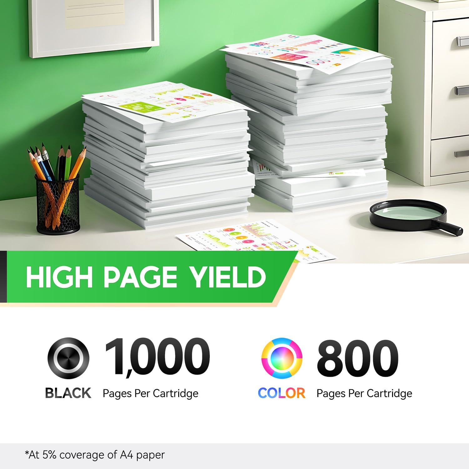 - HIGHER PAGE YIELD: Print more paged with X-Large capacity. 923e ink cartridges combo pack up to 1000 pages per 923e black cartridge, 800 pages per 923e color cartridge.(At 5% coverage on A4 paper)