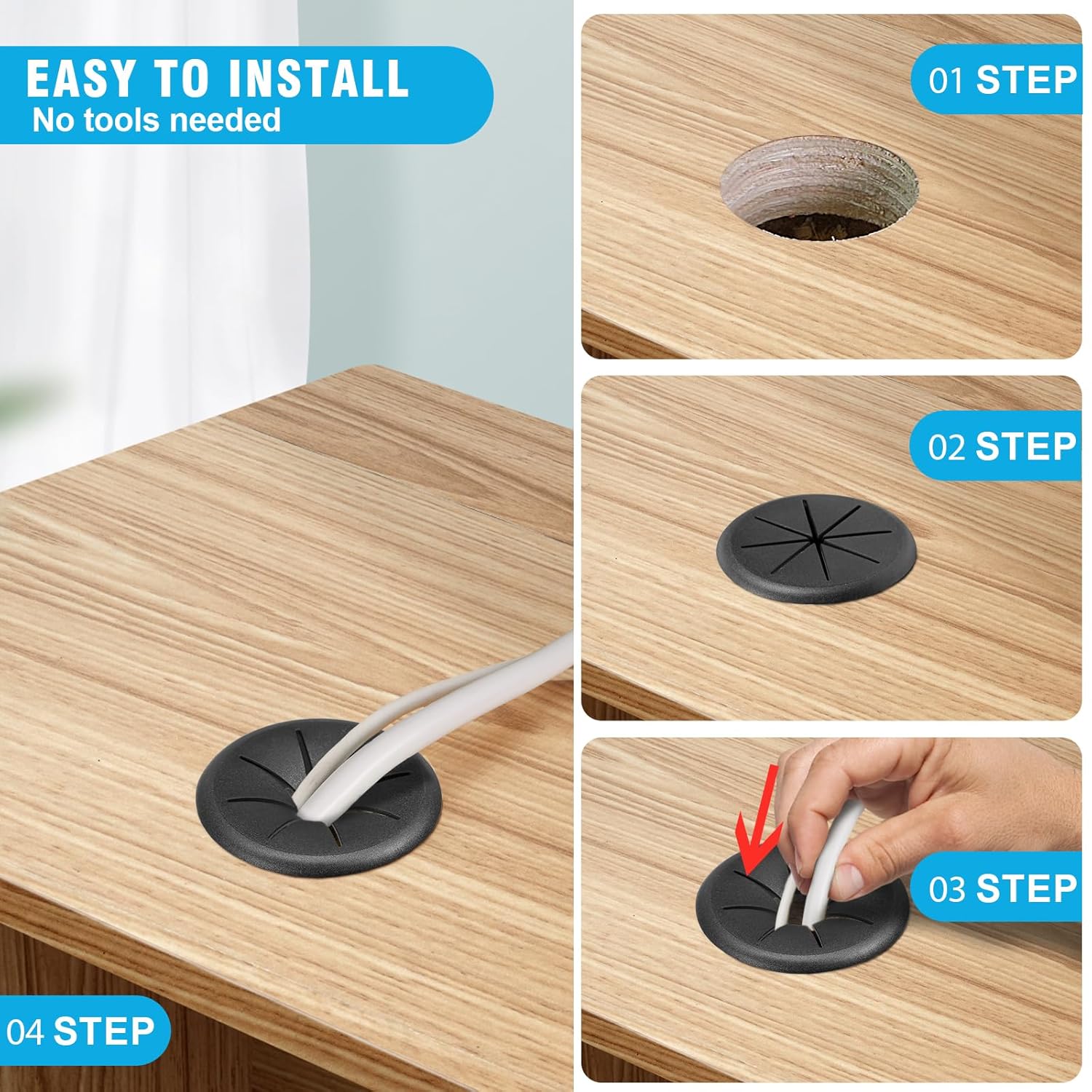 - DELIGHTS PACKAGE -- Your package includes 5 x 2-3/8" desk grommets. Useful Tips: ① Make sure the hole's edges are smooth and free of splinters that could damage your cables or the grommet, ② Place the grommet into the hole. It should fit snugly, ③Finally, route your cables through the desk grommet.