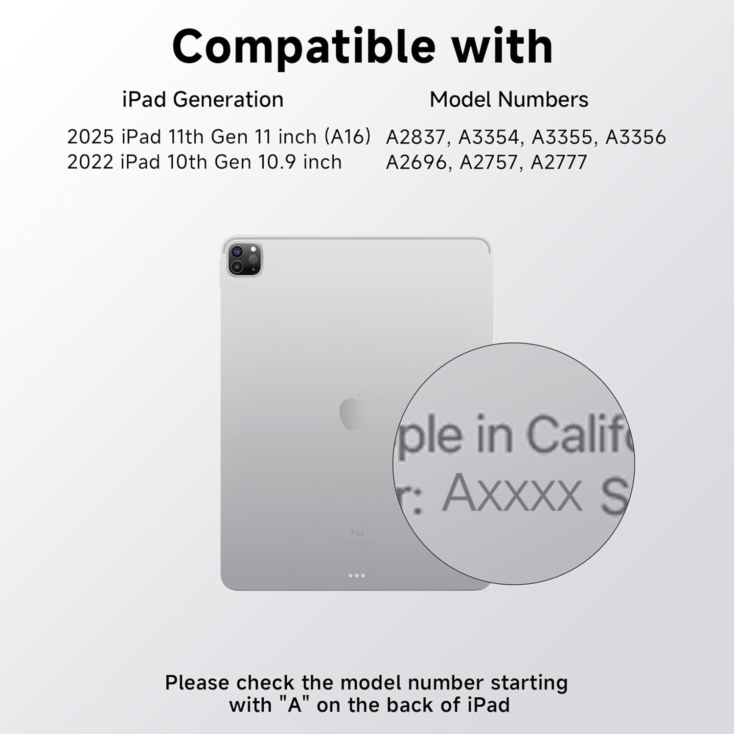 - Compatibility: swivel ipad case with keyboard Perfectly designed for the iPad 11th(A16,2025)/10th Generation; models A2696, A2757, A2777,Prior to purchase, verify the iPad model number (denoted by the prefix "A" on the device's rear casing) to ensure compatibility.