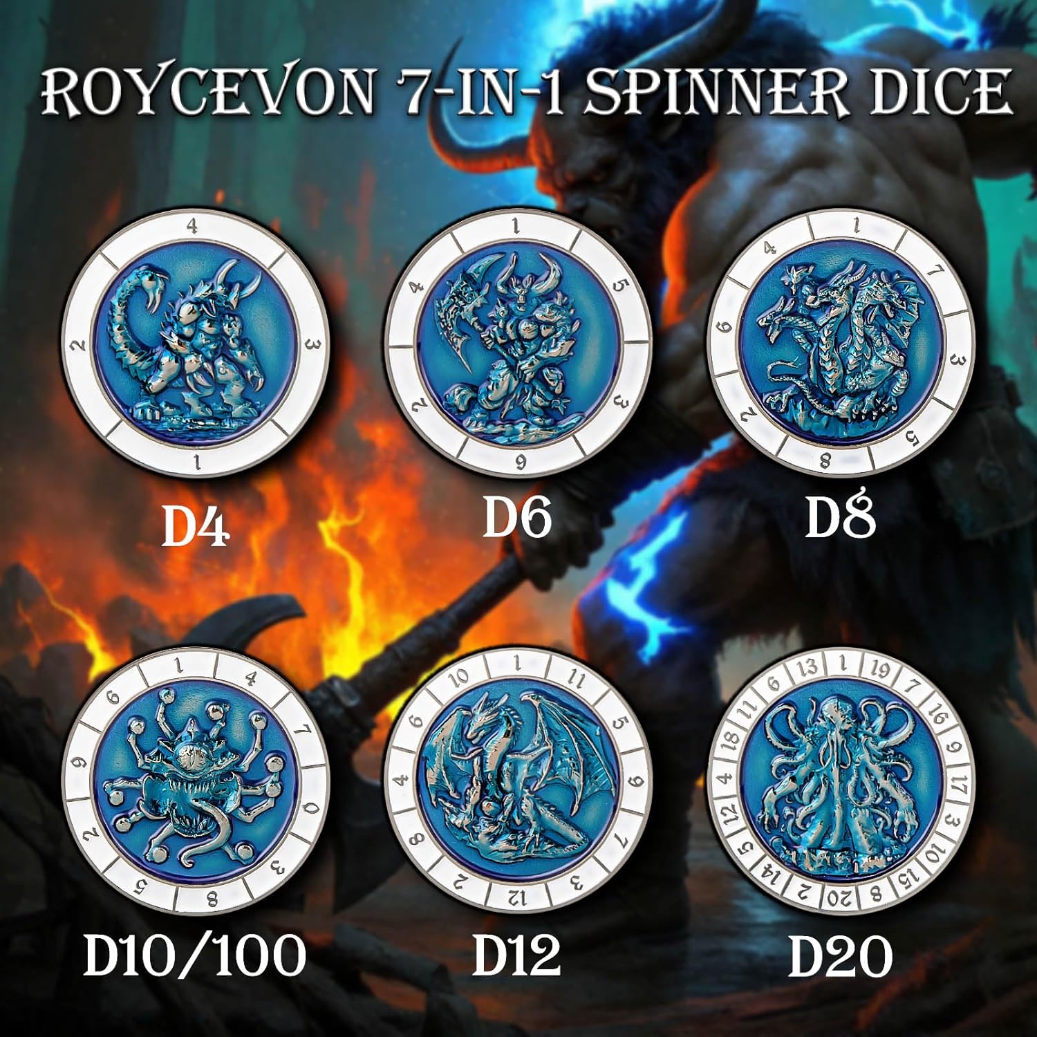 - 7-in-1 Spinner Dice : Metal DND Dice Set is a 7-in-1 rotating dice that combines d4, d6, d8, d10, D10%, d12, and d20. Just have a dice and enjoy 6 different designs, it will give you a different experience