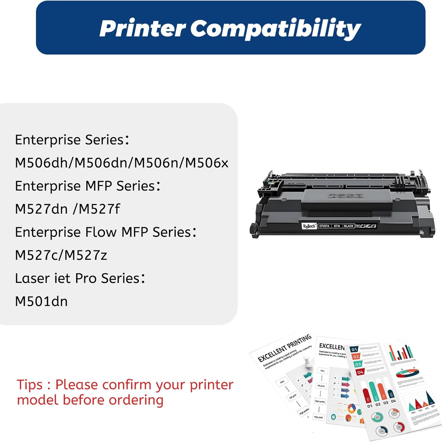 - ăCompatible Modelsă 87A Toner Cartridge Compatible for HP Laserjet Enterprise Flow MFP M527c, M527z; Enterprise M506dh, M506dn, M506n, M506x; Enterprise MFP M527dn, M527f; Pro M501dn printer