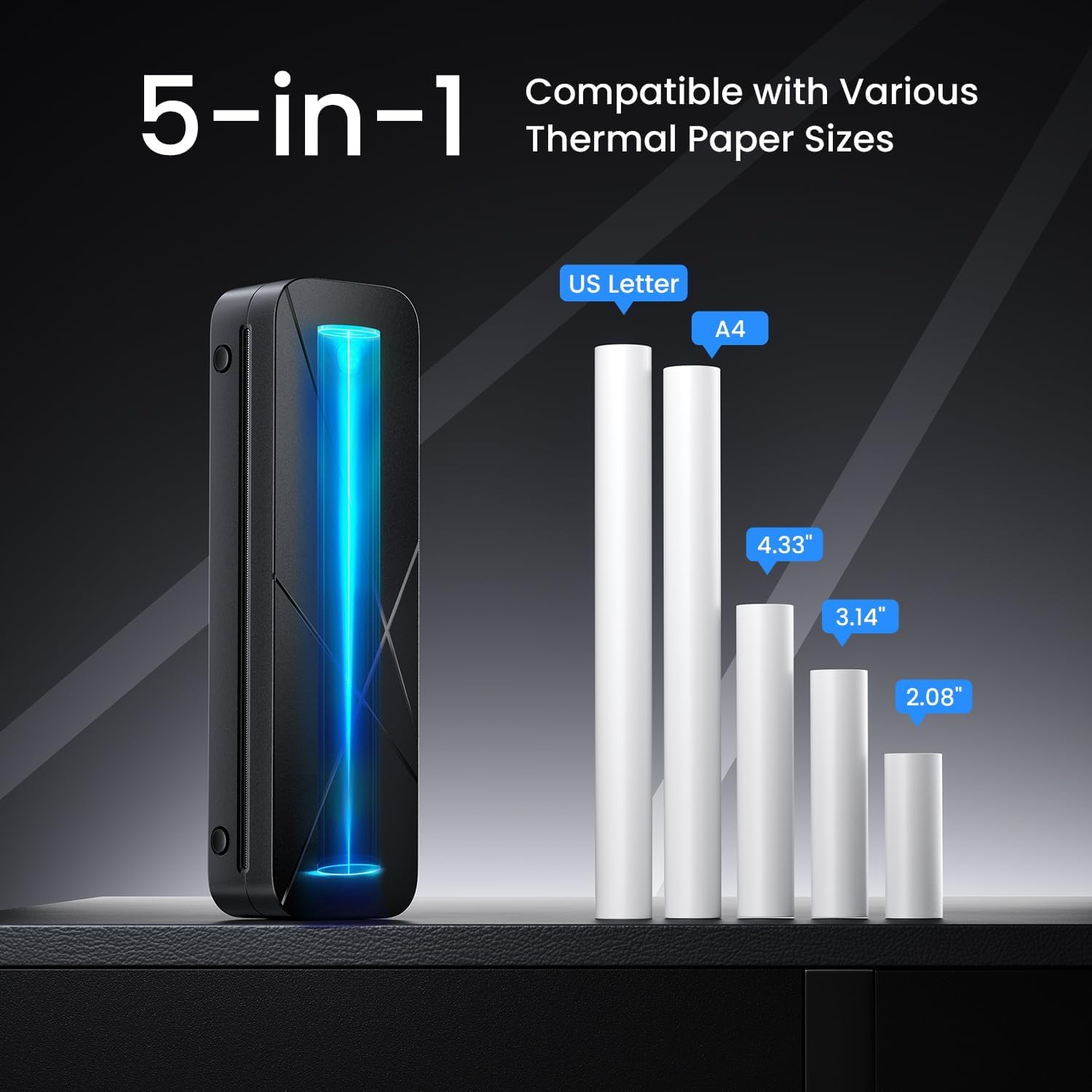 - One Machine, Multiple Uses - Supports Diverse Sizes and Paper Types for Family Sharing: Laptop printer features a built-in paper bin, supporting thermal roll paper, continuous, and single sheet thermal paper. It supports 5 thermal paper sizes: 8.5"x11" US Letter, A4, 4.33" (110mm), 3.14" (80mm), and 2.08" (53mm). Perfect for printing documents, contracts, invoices, study notes, images and boarding passes anytime. Ideal for home and office use