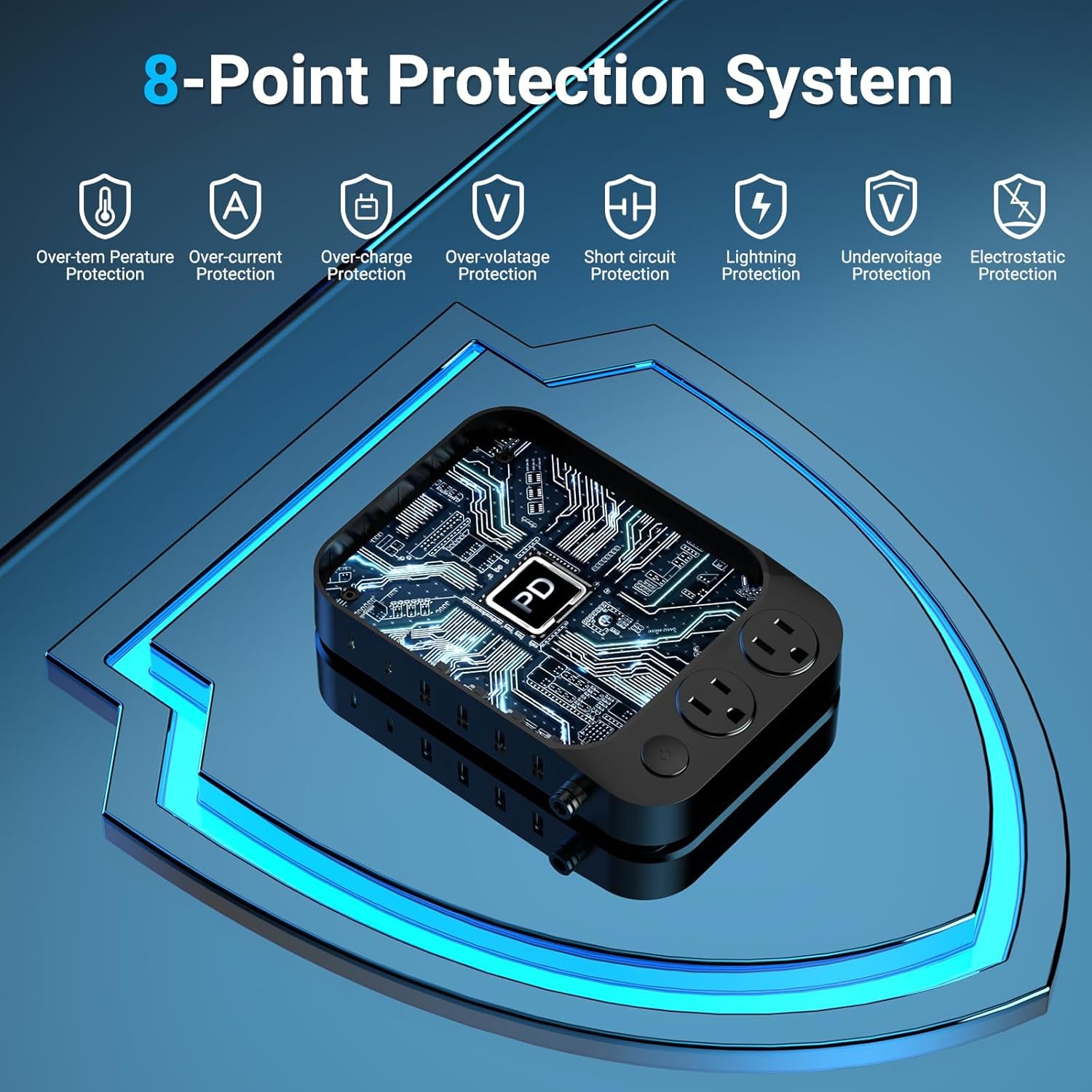 - ă8 in 1 Charging StationsăTwo AC ports can meet high-power charging needs, two PD 20W ports can meet the rapid charging of electronic devices, and four USB ports can meet the simultaneous charging of multiple devices.By one wireless USB charger station, No more cluttered cables & do not need to plug a bunch of wall chargers on your power outlet,keeps your table nice and clean.and freed up outlets in your home and office.