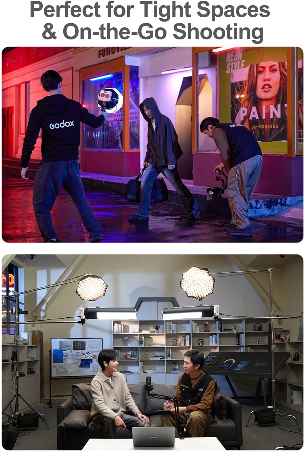 - Ultra-Portable & Versatile Power Options – Weighs only 1 lb with a compact 4.8" × 4.3" × 1.8" design. Power it via AC (adapter included), V-mount/NP-F batteries, power banks, or the Godox BG02 battery grip (sold separately).