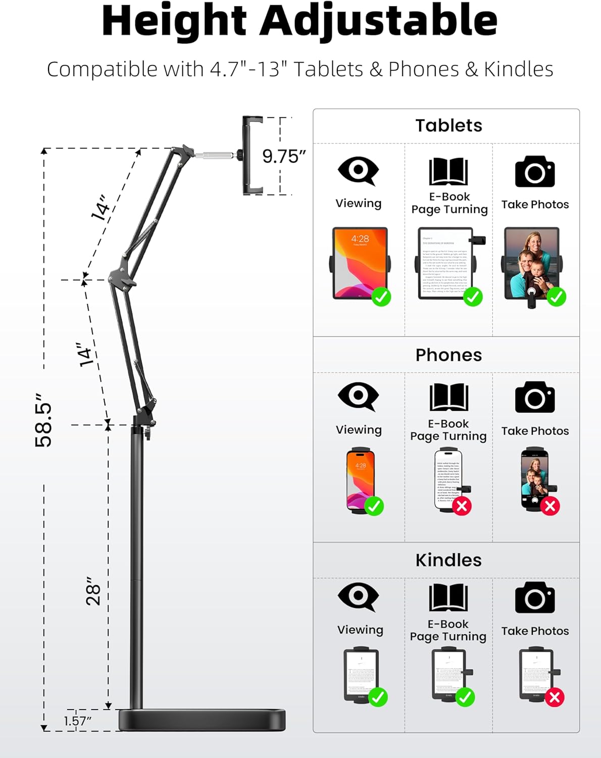- 【Perfect Kindle Stand】This tablet stand features a dual-support structure and a heavy-duty 11-pound base for rock-solid stability. Whether you're lying down, sitting, or standing, the flexible arm adjusts effortlessly to your perfect angle on the bed, sofa, or recliner—without tipping over.
