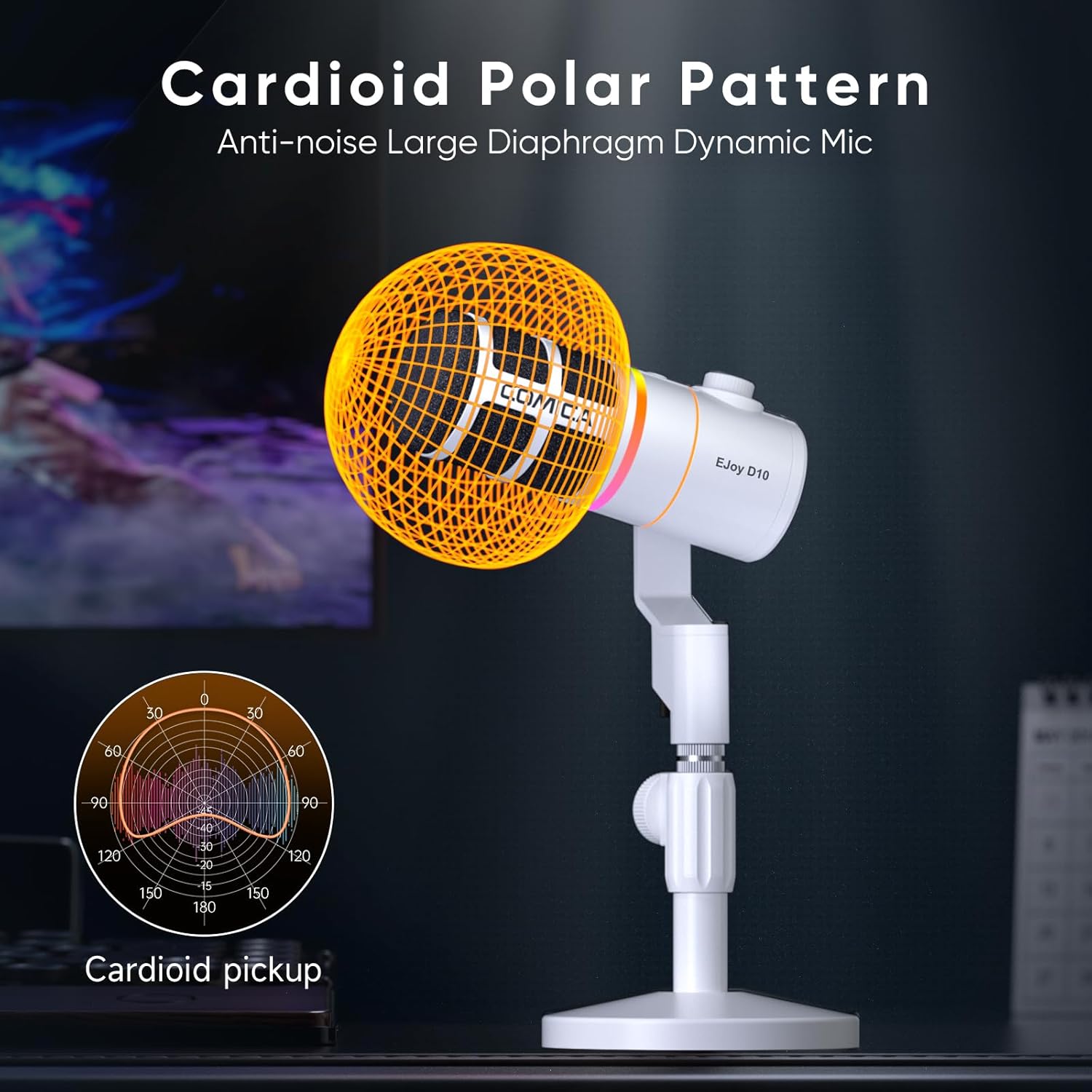 - Cardioid Dynamic Mic:Comica EJoy D10 streaming microphone adopts a cardioid polar pattern design to clearly capture the sound source directly in front of it. This usb microphone is equipped with a large-diaphragm dynamic microphone head. Even in high-sound-pressure outdoor environments, it can demonstrate excellent noise immunity, stable recording and strong durability.