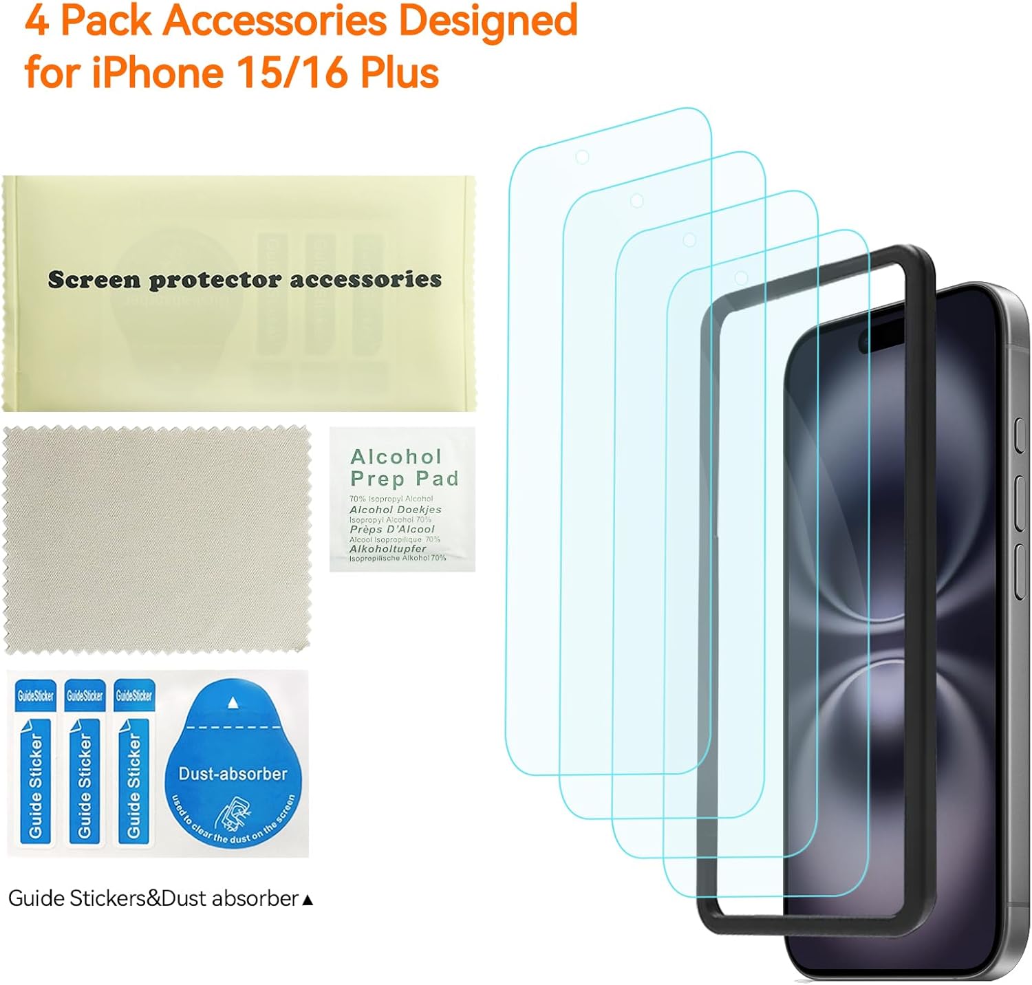 - 【4 Pack Accessories for iPhone 16 plus/15 plus 6.7in】 This product includes 4 pack iPhone 16 plus /15 plus screen protector and Wet/Dry Wipes, Dust Removal Stickers。with Installation Frame*1