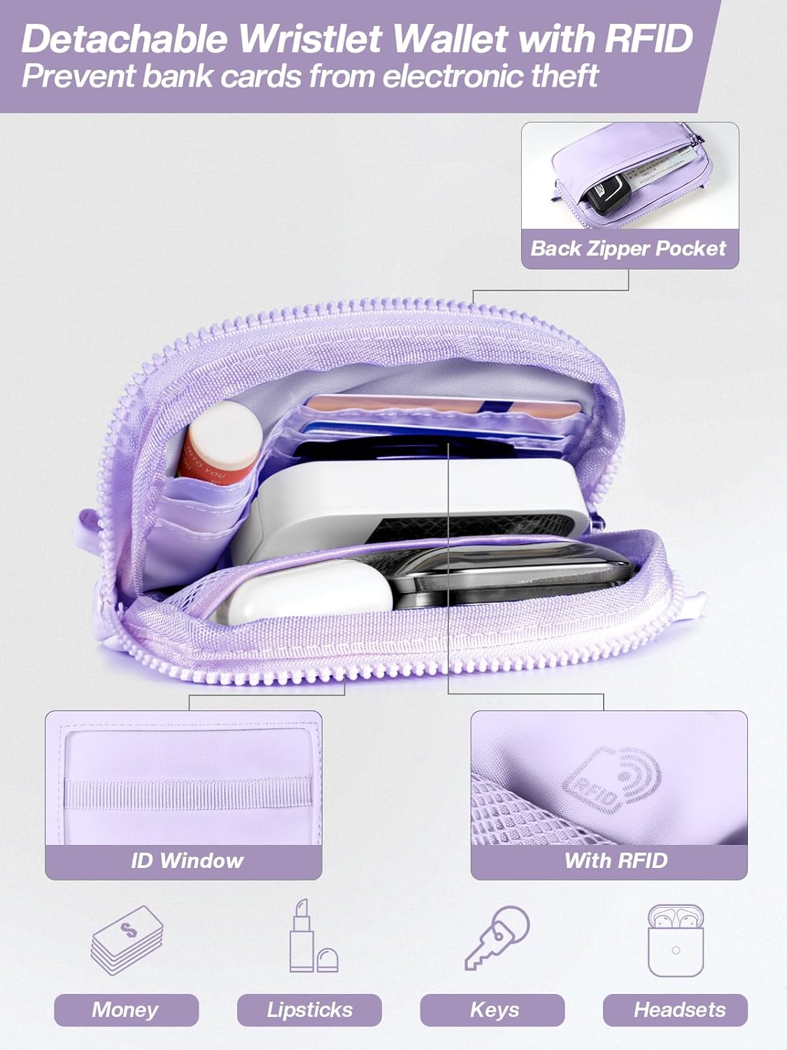 - Detachable Wristlet Wallet: Our detachable wrist wallet is made of waterproof nylon material. The transparent ID window makes it more convenient to carry when going through security or inspection. This cute wristlet wallet also features RFID technology, effectively preventing unauthorized scanning. additionally, this purple wristlet wallet can attach it to a cell phone lanyard or hang it from any buckle, and you can mix and match according to your needs and preferences.