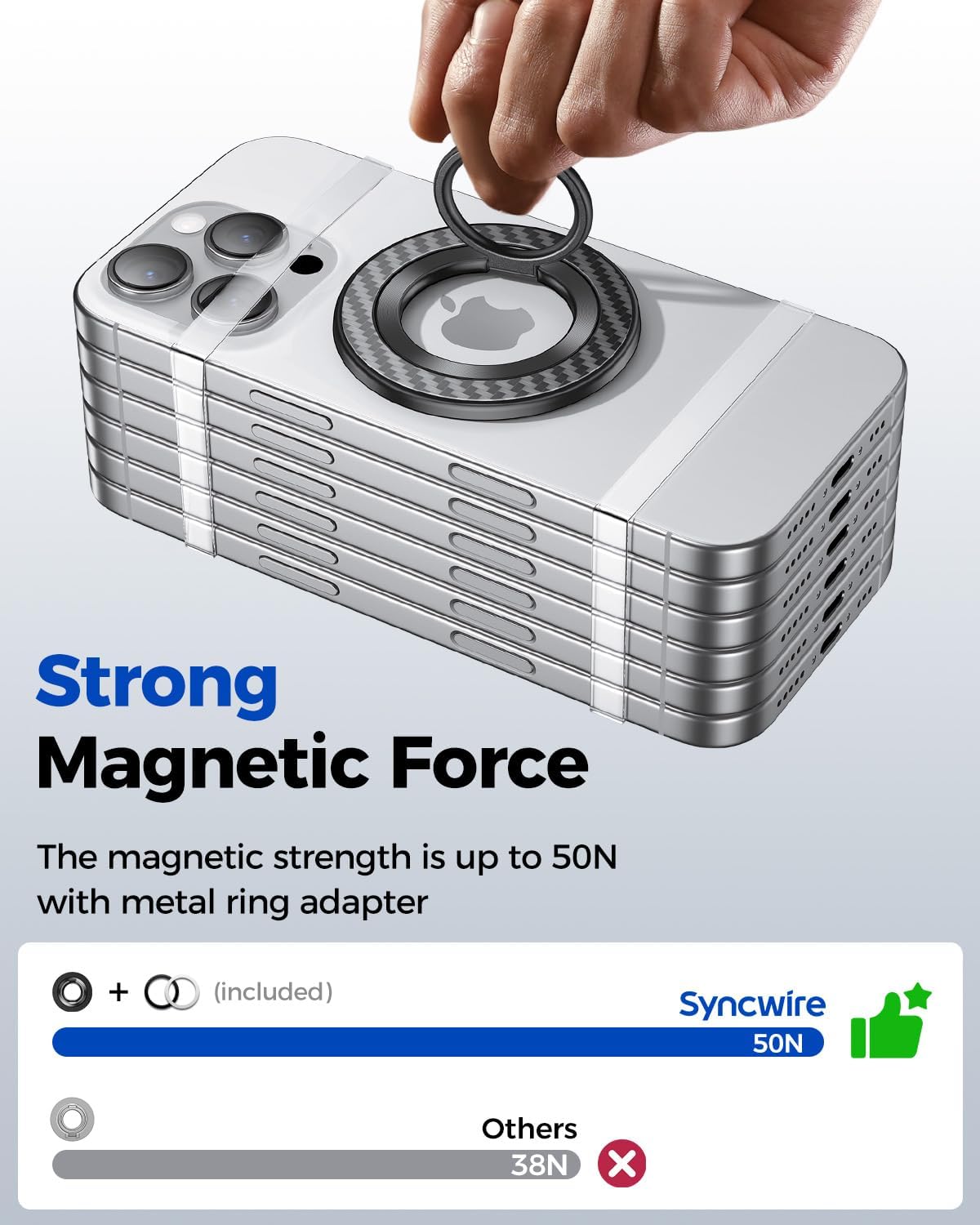 - 【Super Strong Magnetic】The Syncwire Carbon Fiber Magnetic phone ring holder is made with N55 NdFeB magnets, providing exceptional magnetic force. You can securely attach your phone to the MagSafe magnetic phone ring holder with just one finger, experiencing a strong hold that resists shaking or movement. The magnetic force can be enhanced by 5 times when used with the provided metal ring.