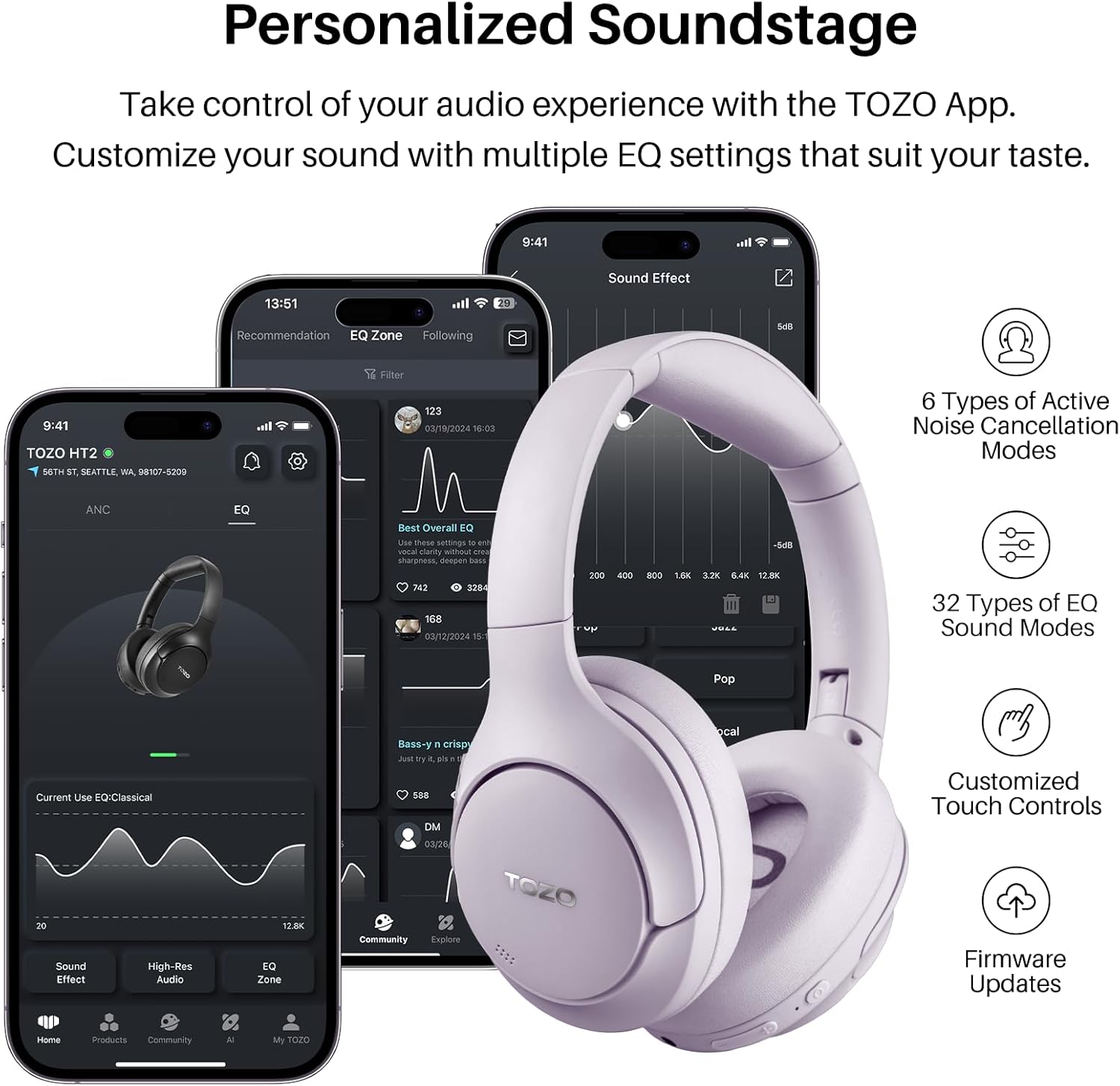 TOZO HT2 Hybrid Active Noise Cancelling Headphones, Wireless Over Ear Bluetooth Headset, 60H Playtime, Hi-Res Audio Custom EQ via App Deep Bass Comfort Fit Ear Cups, for Home Office Travel Purple