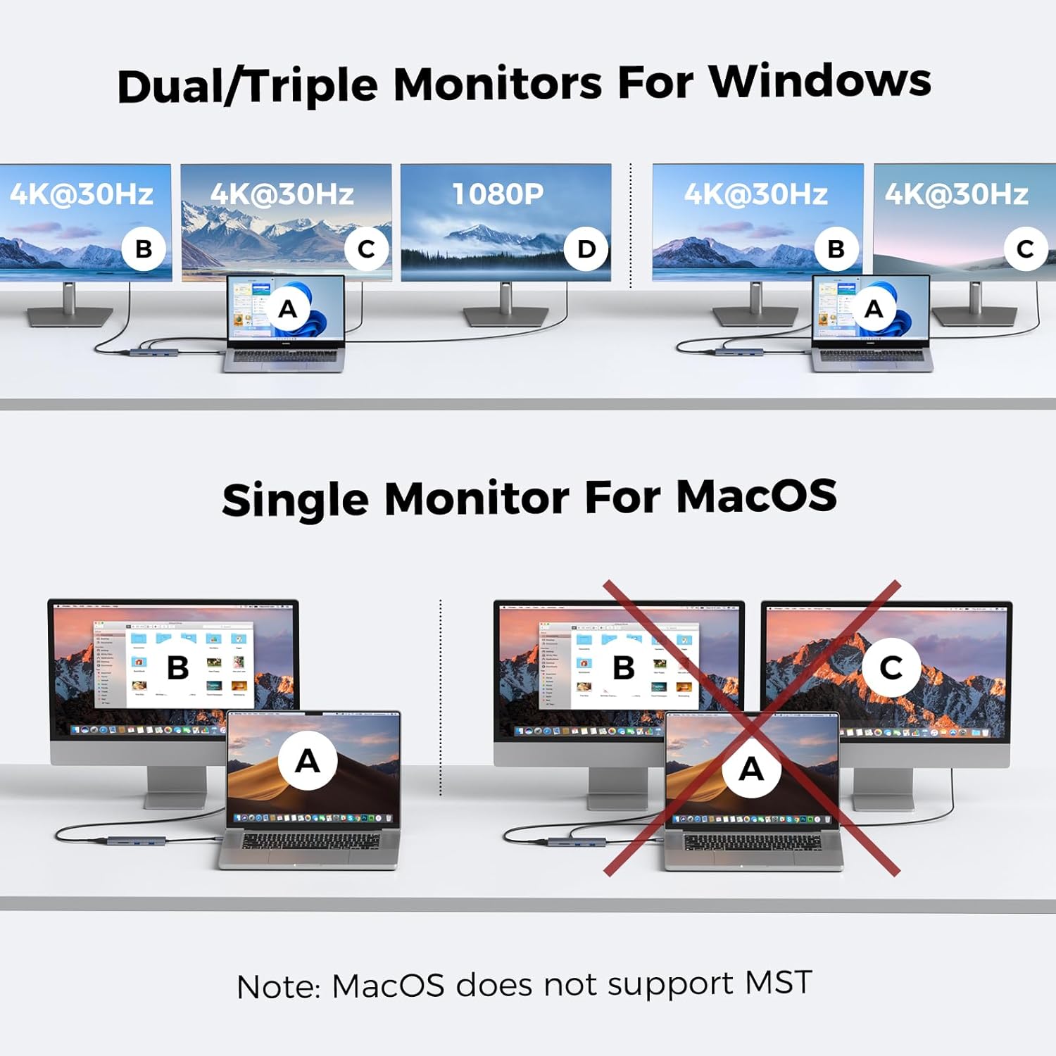- ăTriple / Dual Display Supportă The usb c hub with usb c video out supports dual 4K@30Hz and triple display(2* 4K@30Hz + 1*1080P), Ideal for DP1.4 laptops to extend to dual 4K@30-60Hz displays (Note: MacBook supports only one extended monitor).