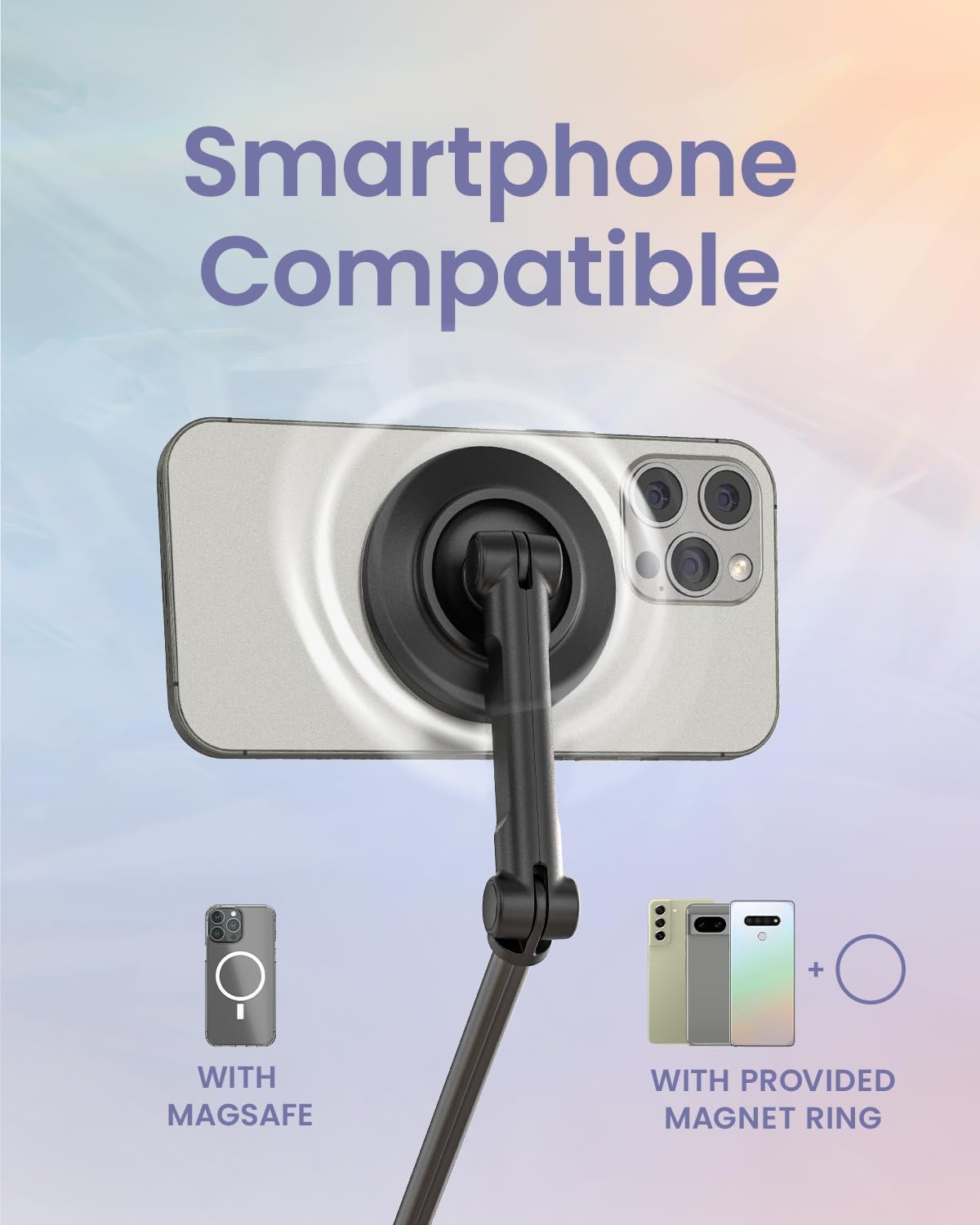 - Strong Magnetic Phone Mount: Equipped with strong N52 magnets for secure, clamp-free attachment. This MagSafe tripod perfectly fits iPhone 12/13/14/15/16 series (including Pro, Max, and Mini), delivering a smooth snap-on experience every time. Includes metal rings for Android phones and non-MagSafe cases.