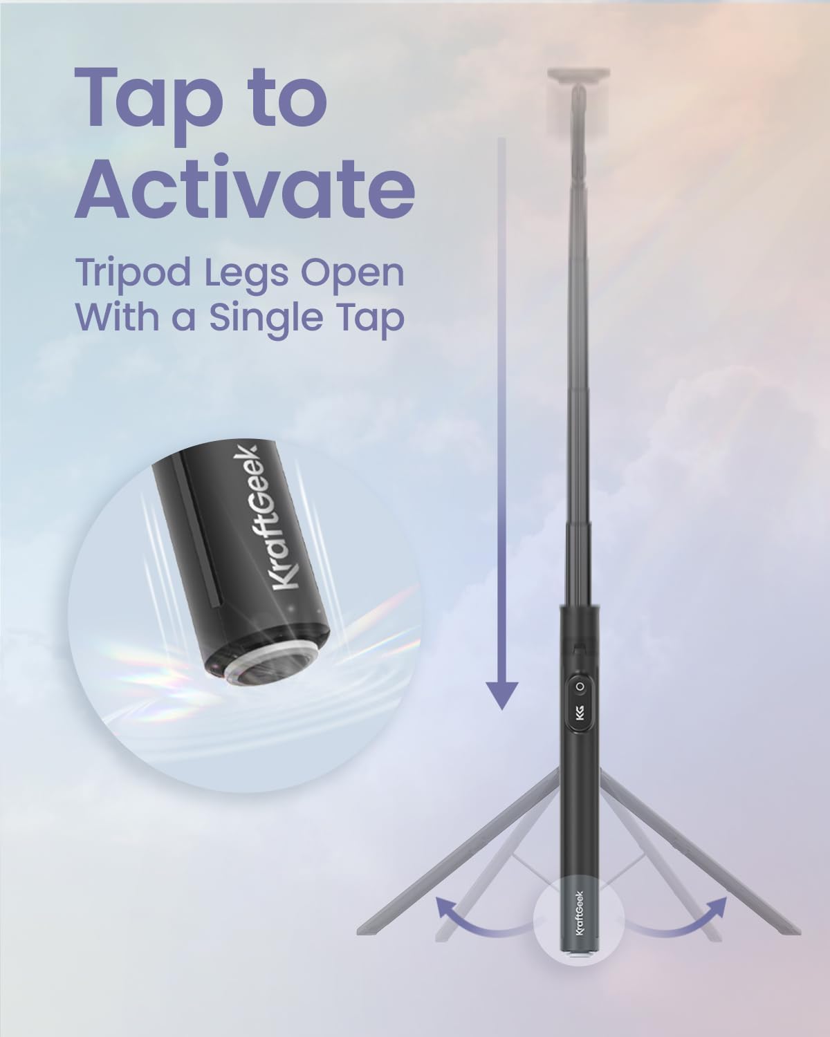 - Auto-Open Design, Fast & Nail-Friendly Setup: With a single tap, the KraftGeek JustTap Tripod instantly opens into phone tripod mode. This selfie stick tripod for iPhone is easy to set up one-handed and gentle on your nails — perfect for quick shots and filming.