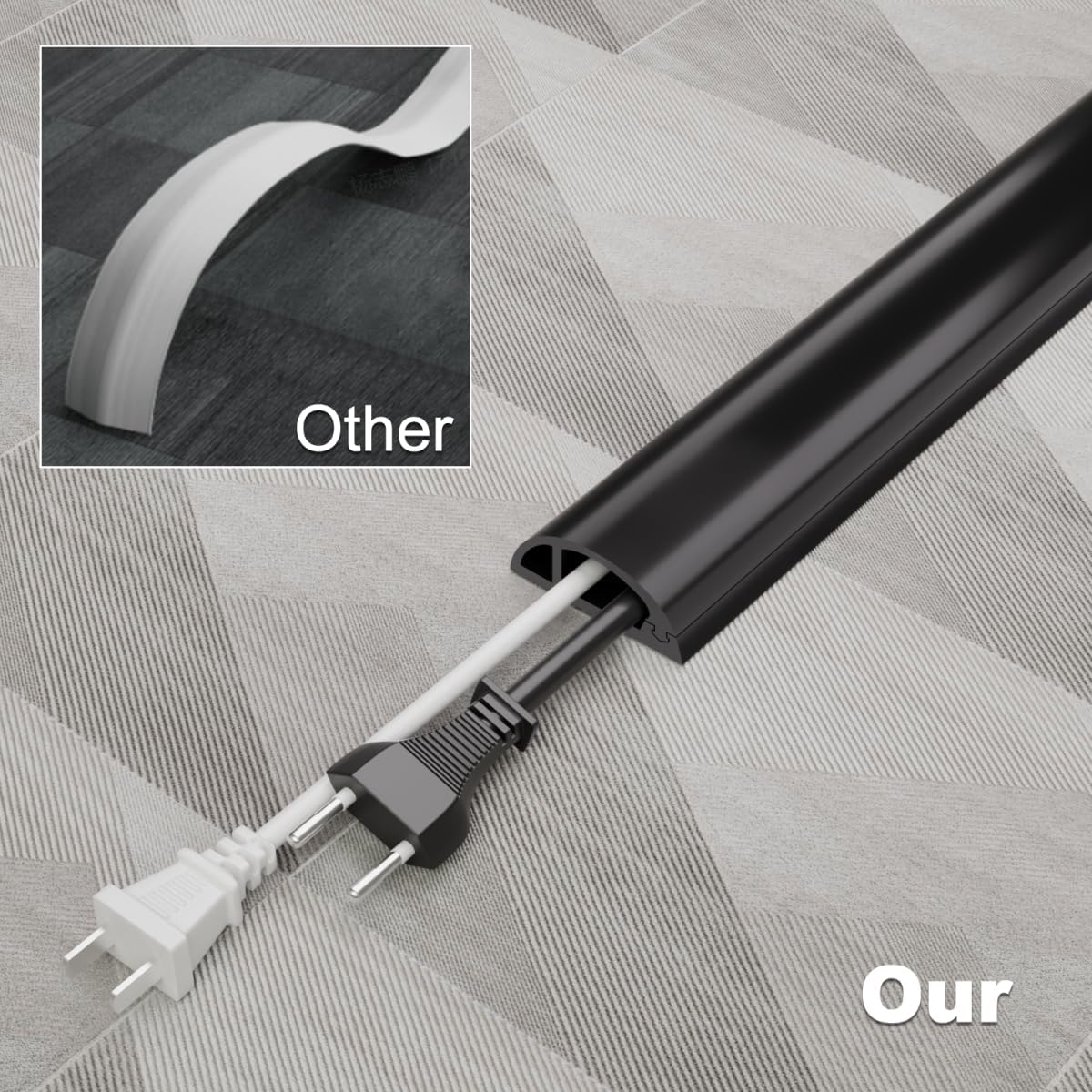 - Perfect Size and Capacity: Available in 4FT/6FT/10FT lengths, our cord cover floor holds 1-3 cables from power strips, and TV wires, to outdoor lighting cords - Inner Channel: 0.65“W x 0.4” H. Note: please measure your cables before ordering.