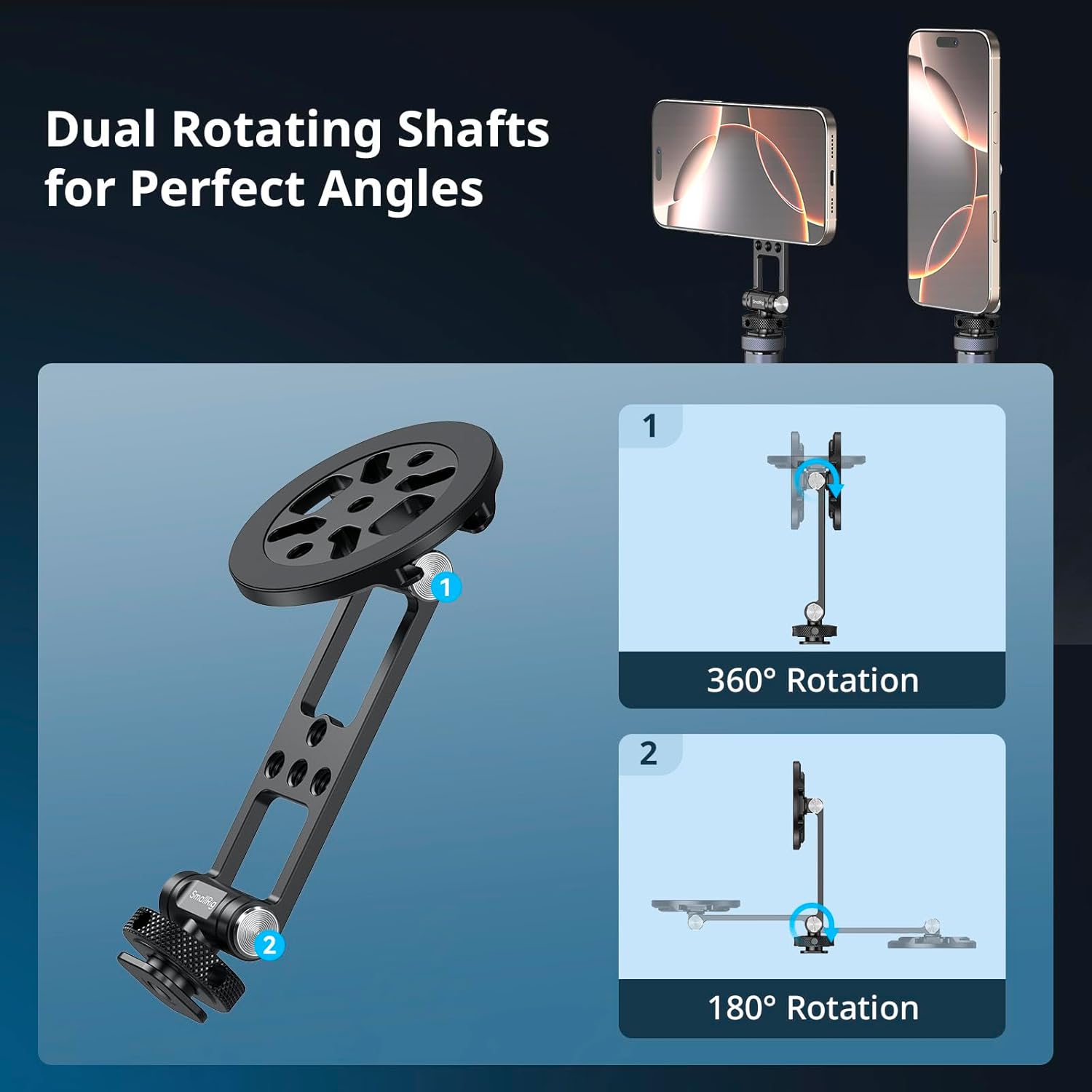 - Dual Rotating Shafts for Flexible Angles: Adjust your phone's position effortlessly with two rotating shafts. Ensure optimal framing during mobile photography or teleprompter setups.