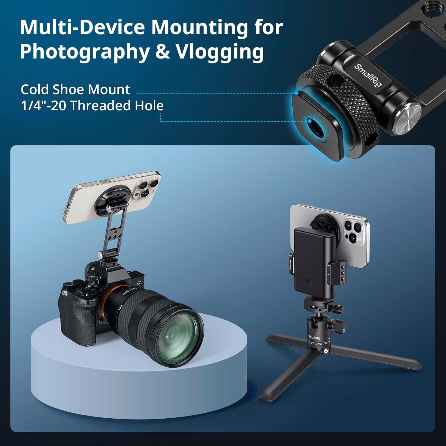 - Universal Phone Holder: This multifunctional phone clamp can be mounted on the top of a camera or tripod through 1/4"-20 threaded hole or cold shoe at the bottom for photography, live-streaming, vlogging, interviews, etc