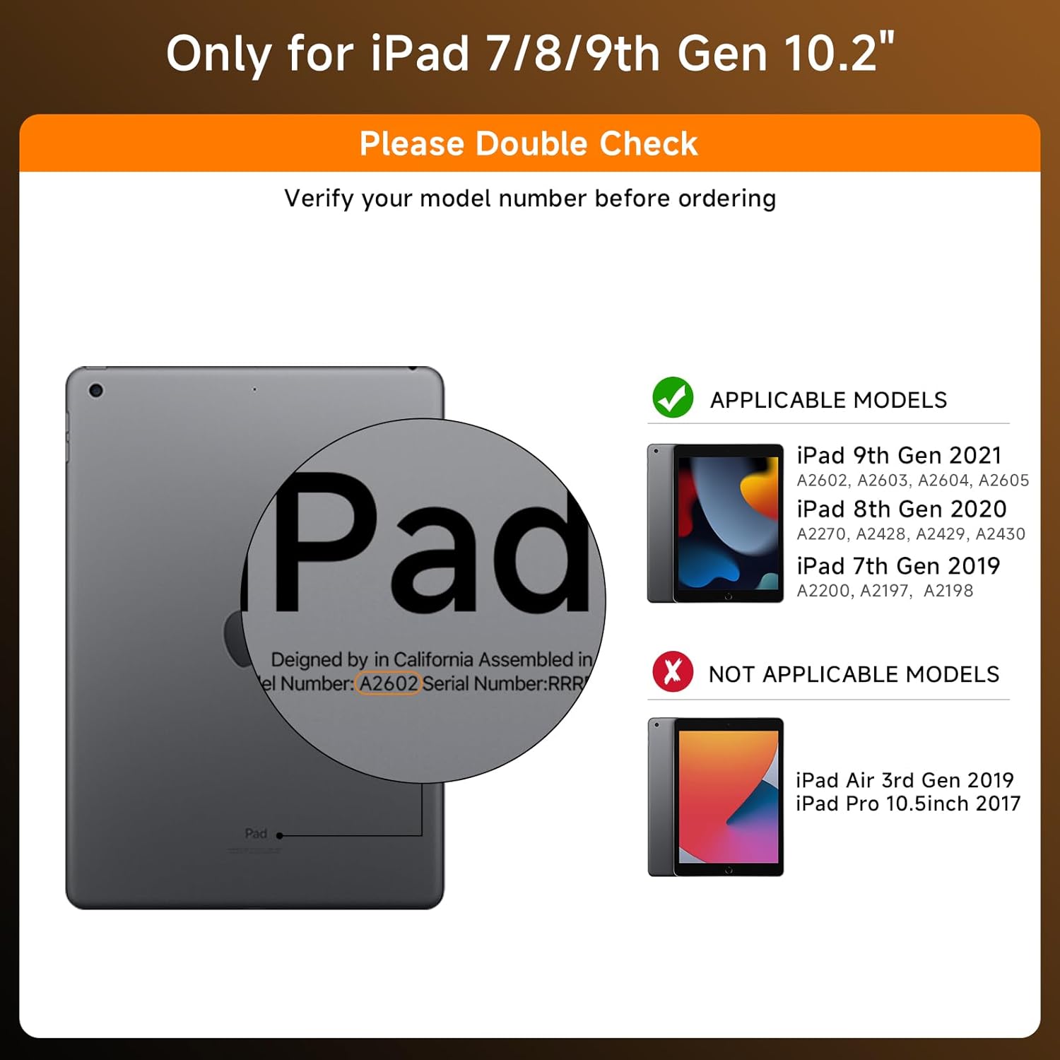 - Compatibility: Compatible with iPad 9th Gen (2021, 10.2 inch) Models A2602 A2603 A2604 A2605; iPad 8th Gen (2020, 10.2 inch) Models A2270 A2428 A2429 A2430; iPad 7th Gen (2019, 10.2 inch) Models A2200 A2197 A2198; Please check your iPad model number on the back of your device (starting with "A") before purchasing to ensure compatibility.