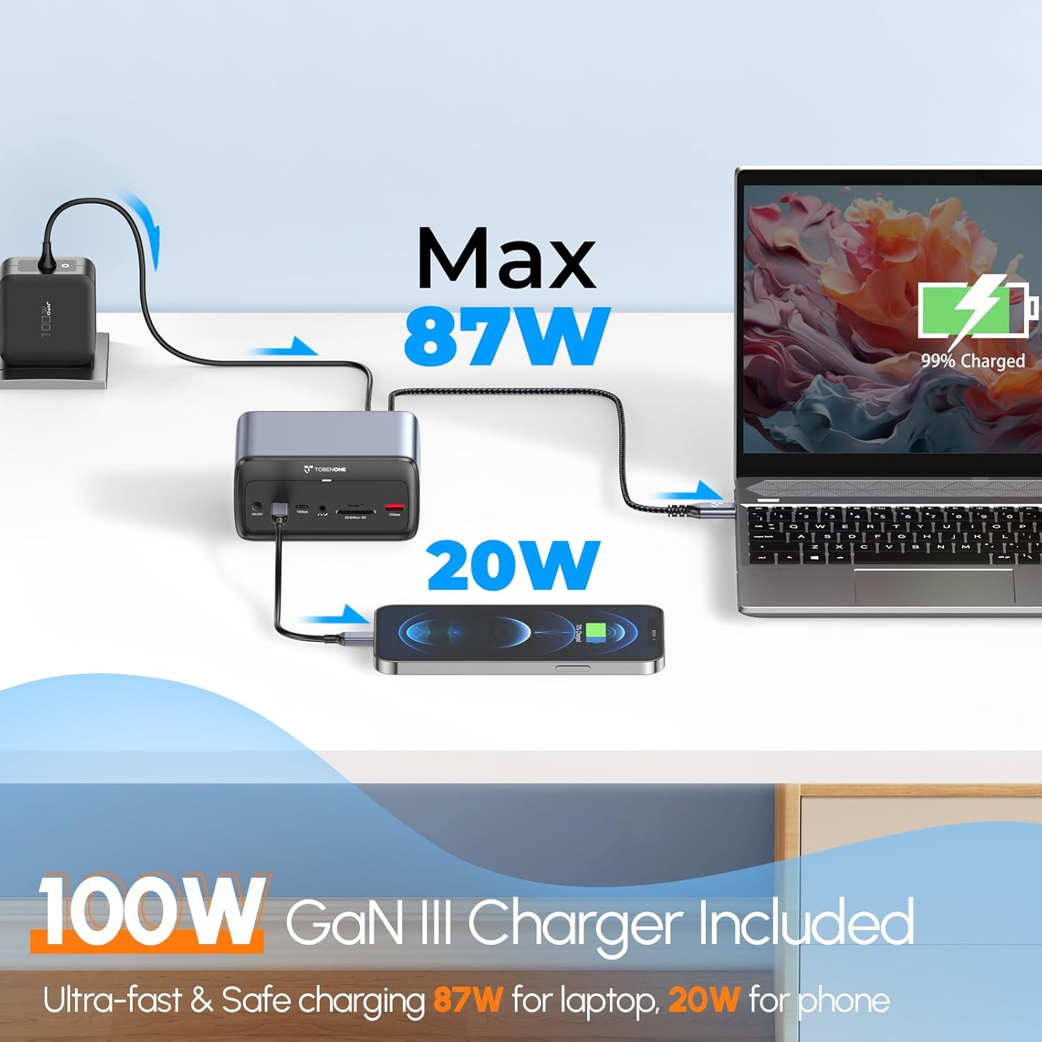 - Built-in 100W GaN III Charger: Equipped with an independent 100W GaN III charger, the laptop docking station delivers up to 87W to your laptop via USB-C PD 3.0 and 20W to phones/tablets through the front USB-C port. Gallium Nitride (GaN) tech ensures safer, more stable charging for the dock and laptop, eliminating the need for an extra laptop power supply