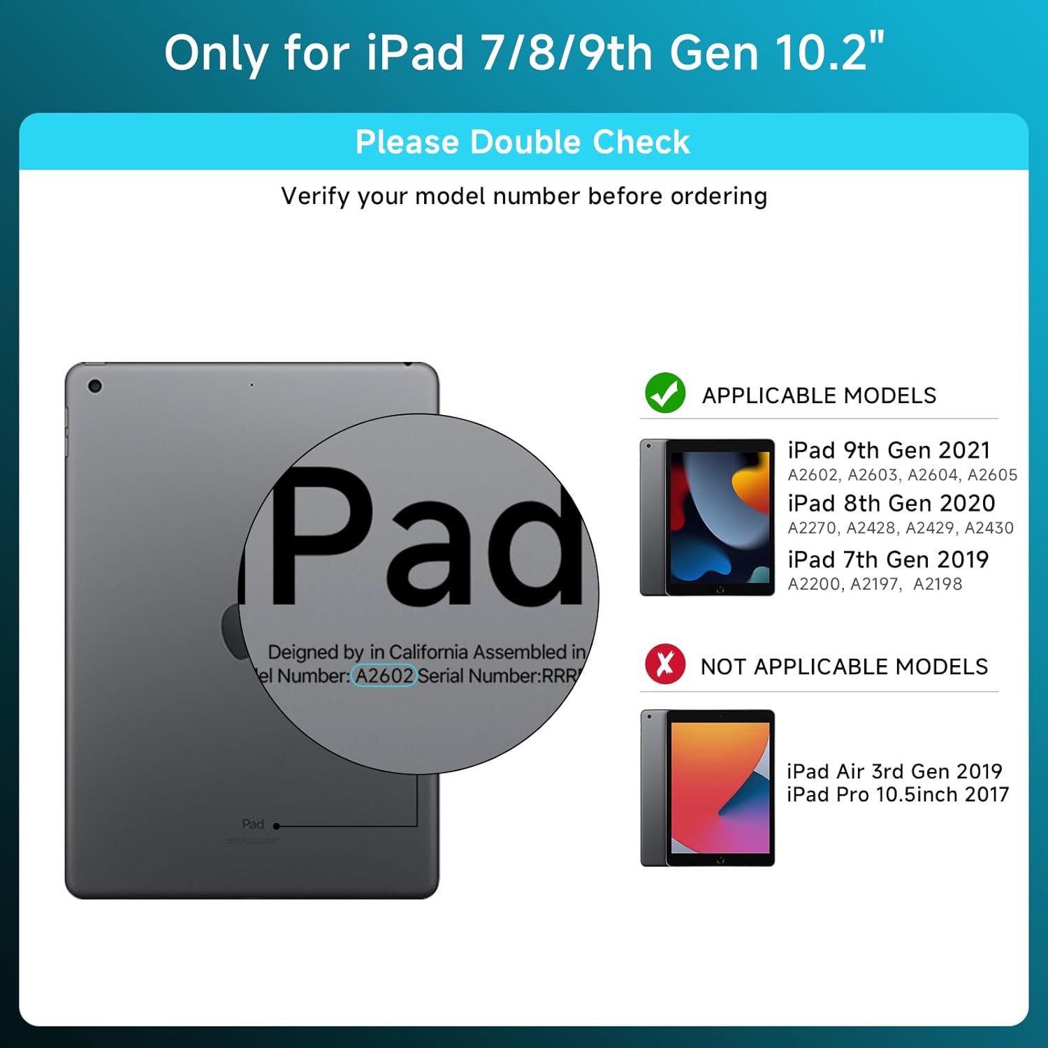 - Compatibility: Compatible with iPad 9th Gen (2021, 10.2 inch) Models A2602 A2603 A2604 A2605; iPad 8th Gen (2020, 10.2 inch) Models A2270 A2428 A2429 A2430; iPad 7th Gen (2019, 10.2 inch) Models A2200 A2197 A2198; Please check your iPad model number on the back of your device (starting with "A") before purchasing to ensure compatibility.