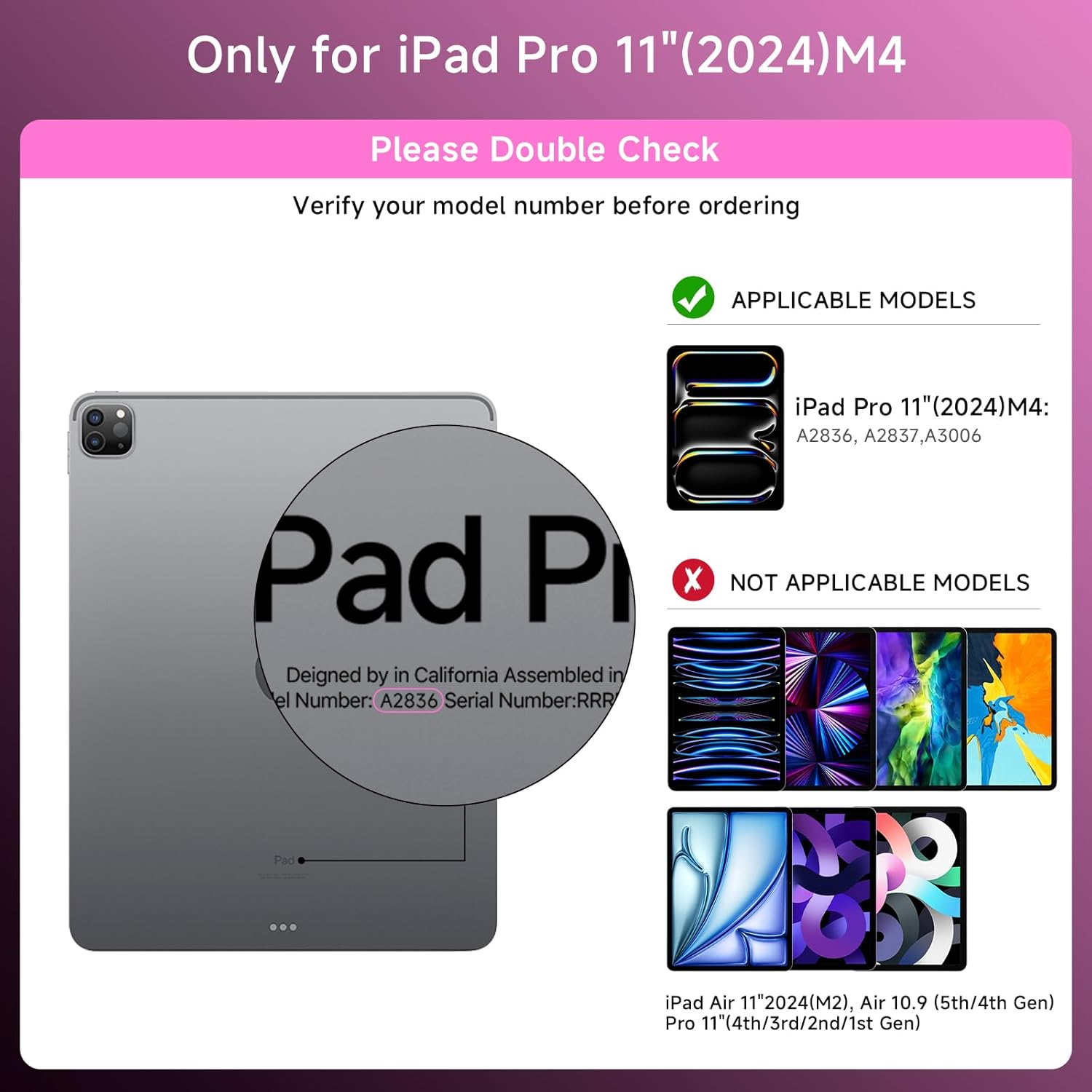 - Compatibility: only for iPad Pro 11 inch (M4, 2024); Model:A2836,A2837,Please check your iPad model number on the back of your device (starting with "A") before purchasing to ensure compatibility.