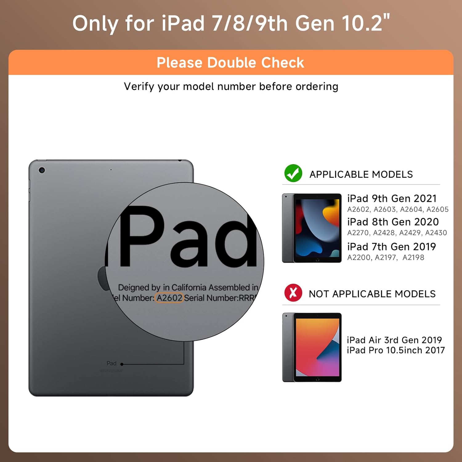 - Compatibility: Compatible with iPad 9th Gen (2021, 10.2 inch) Models A2602 A2603 A2604 A2605; iPad 8th Gen (2020, 10.2 inch) Models A2270 A2428 A2429 A2430; iPad 7th Gen (2019, 10.2 inch) Models A2200 A2197 A2198; Please check your iPad model number on the back of your device (starting with "A") before purchasing to ensure compatibility.