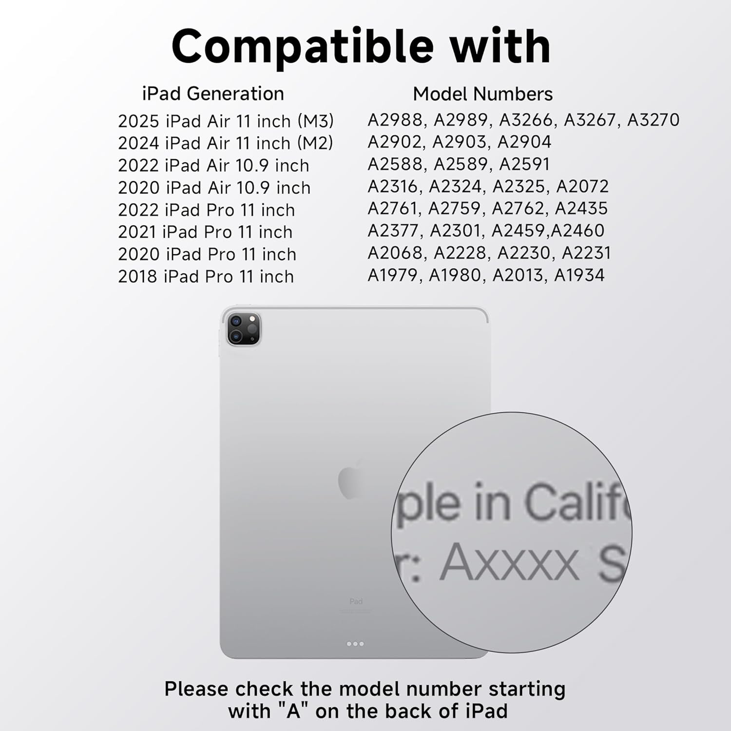 - Compatibility: Perfectly designed for the iPad Air 11 inch(M3/M2 2025/2024), iPad Pro 11 inch (2022/2021/2020/2018), iPad Air 5th Generation (2022), and iPad Air 4th Generation (2020); models A2759, A2435, A2761, A2759, A2435, A2761, A2316, A2324, A2325, A2072, A2377, A2459, A2301, A2460, A2068, A2228, A2230, A2231, A1980, A2013, A1934, and A1979,Prior to purchase, verify the iPad model number (denoted by the prefix "A" on the device's rear casing) to ensure compatibility.