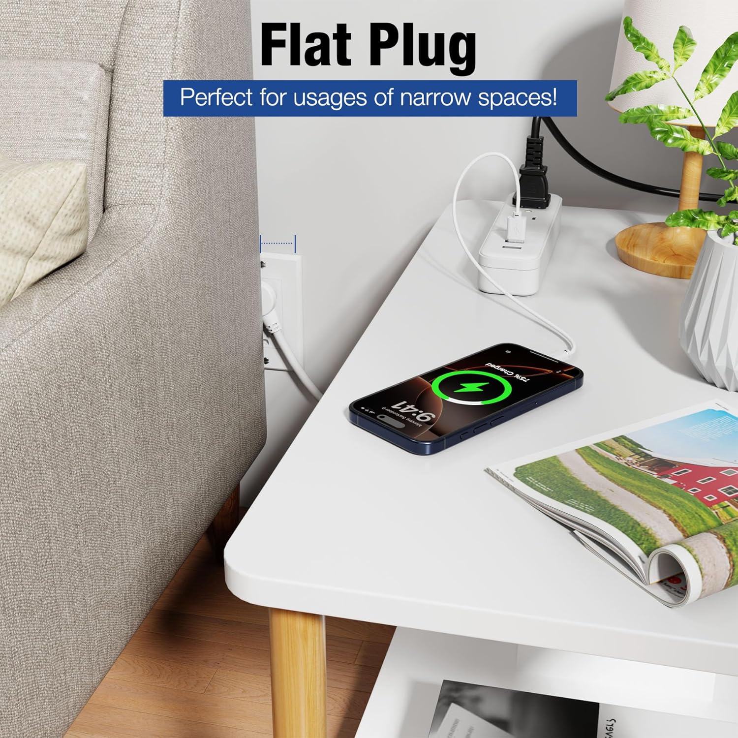 - Flat plug power strip is designed to snugly fit against the wall for space saving, allowing it to be easily hidden behind furnitures, beds or refrigerators. It's perfect for tight areas, ensuring that your setup remains tidy and organized while providing convenient power access;