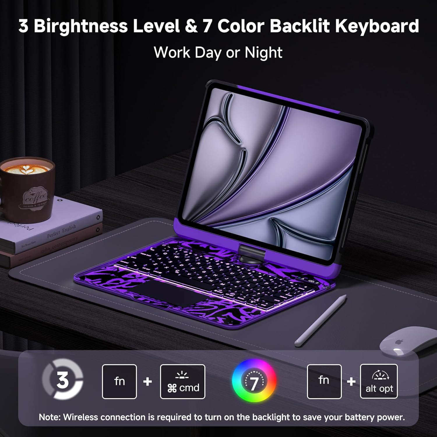 iPad Keyboard Case for iPad 10th Gen (2022) & 11th (A16, 2025), Magic Wireless Keyboard with Trackpad 7 Color Backlit 360° Rotating Stand Transparent Protective Cover with Pencil Holder (Purple)