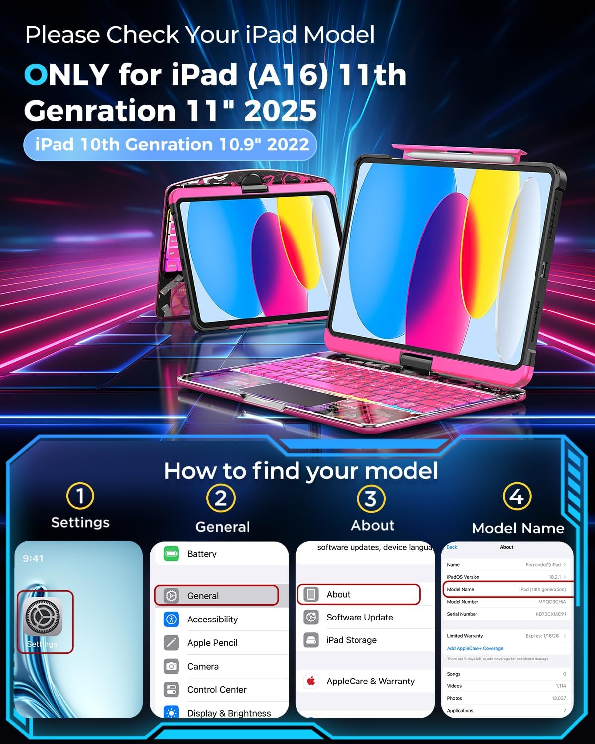 - Compatibility: Perfectly designed for the iPad (A16) 11th Generation 2025 (Model: A3354/A3355/A3356 ) & 10th Generation 10.9" 2022 (Model: A2757/A2777/A2696). Please ensure the model number before making your purchase as it is not compatible with any other devices