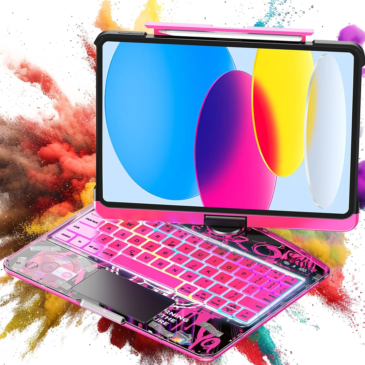 TSQQST Clear Wireless Keyboard Case for iPad (A16) 11th Generation 11-inch 2025/ iPad 10th Generation 10.9-inch 2022 with Pencil Holder & Multi-Touch Trackpad, 7-Color Backlight, 360 Rotatable, Pink
