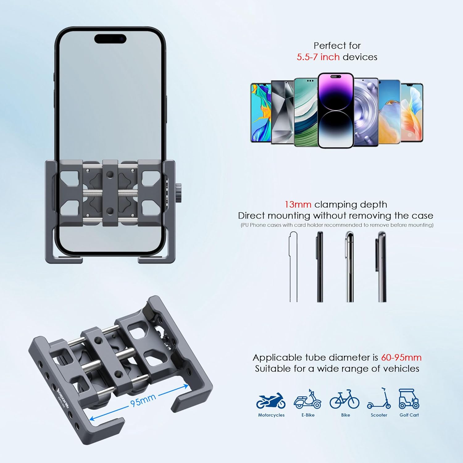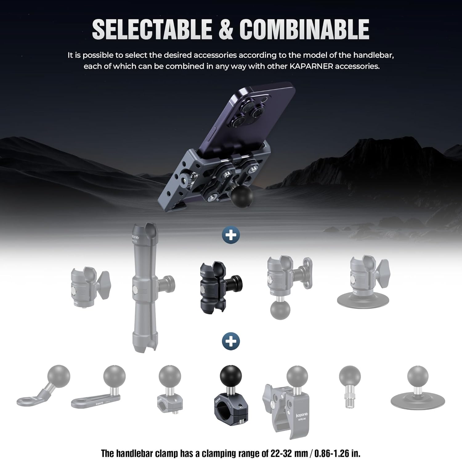 - Widely Compatible: The Kaparner motorcycle phone mount is designed for handlebars with diameters ranging from 0.8 inches to 1.14 inches, ensuring compatibility with a broad spectrum of vehicles, including bicycles, ATVs, snowmobiles, and others. Its adjustable U-bolt base provides a secure and stable fit, preventing any slipping or shifting during operation