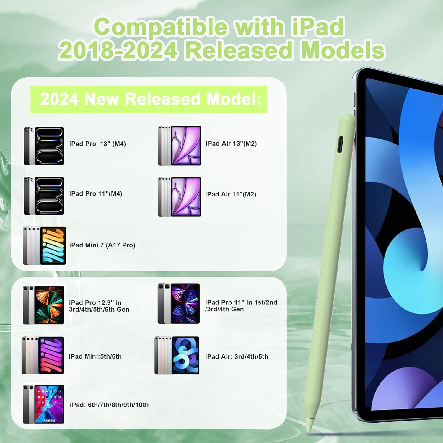 - USB-C Fast Charge Compatibility: Upgrade Stylus pencil Same as Apple Pencil 2nd Generation supports USB-C Fast Charge and Compatible With iPad 2018-2024 Model: iPad Pro 13”(M4)/12.9”/11”,iPad Air 6(M2)/5/4/3,iPad Mini 7(A17 Pro)/6/ 5,iPad10/9/8/7/6 and fully charging in 30 minutes and up to 8 hours of continuous use and Power display: Charging: green light breathes; Using: green light stays on; Less than 20% power: red light flashes