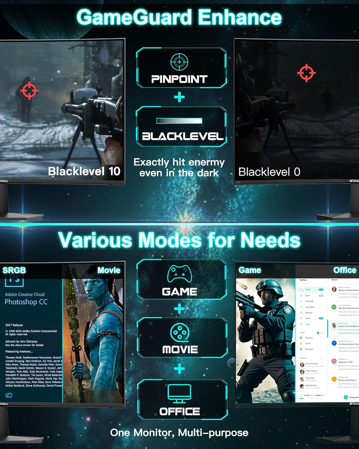 - Gamer-Centric: Game Assistant: Black Level Adjustment(shadow booster), Crosshair, Timer, Counter | Preset Modes:FPS/RTS/Racing,etc.